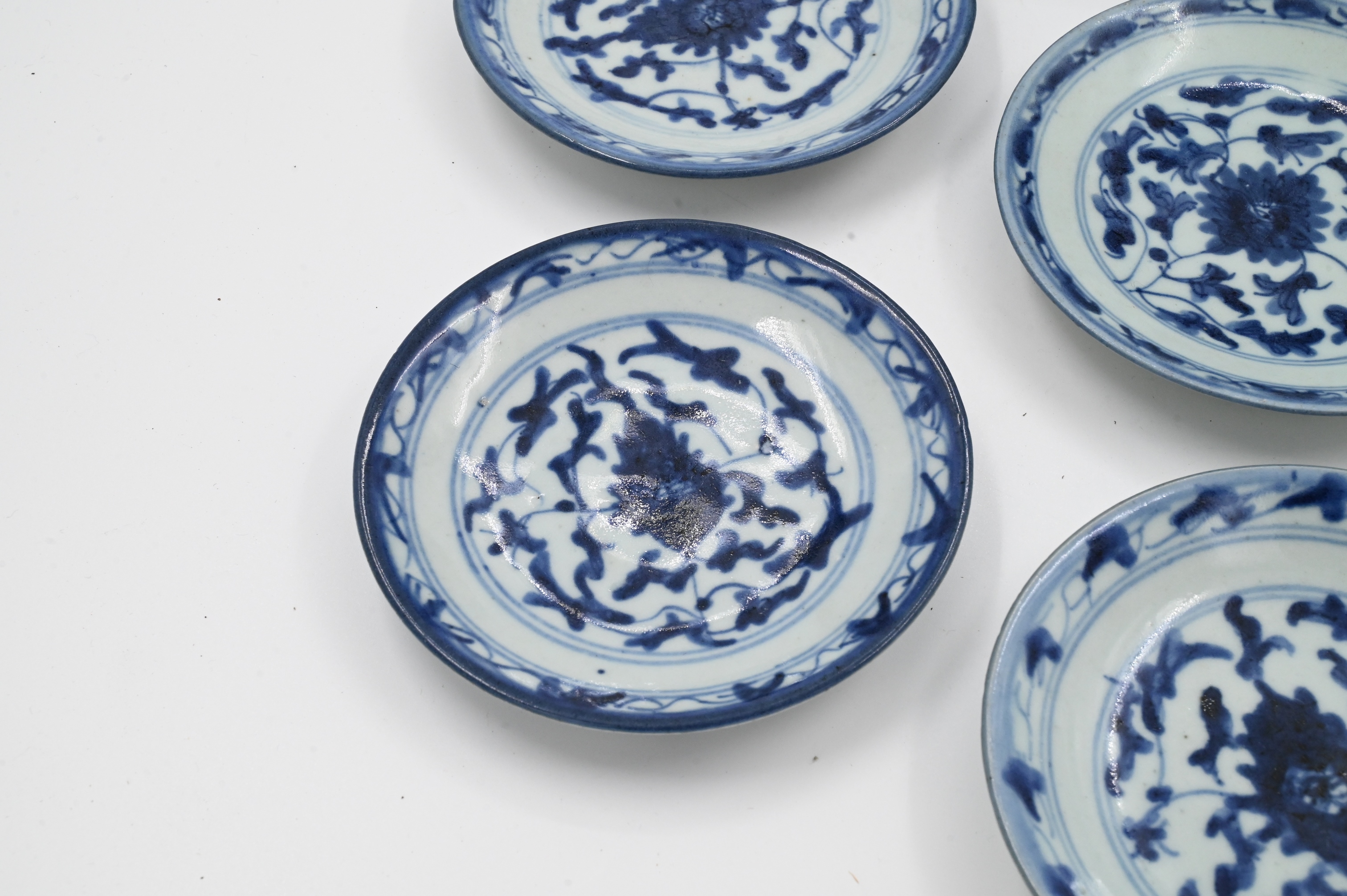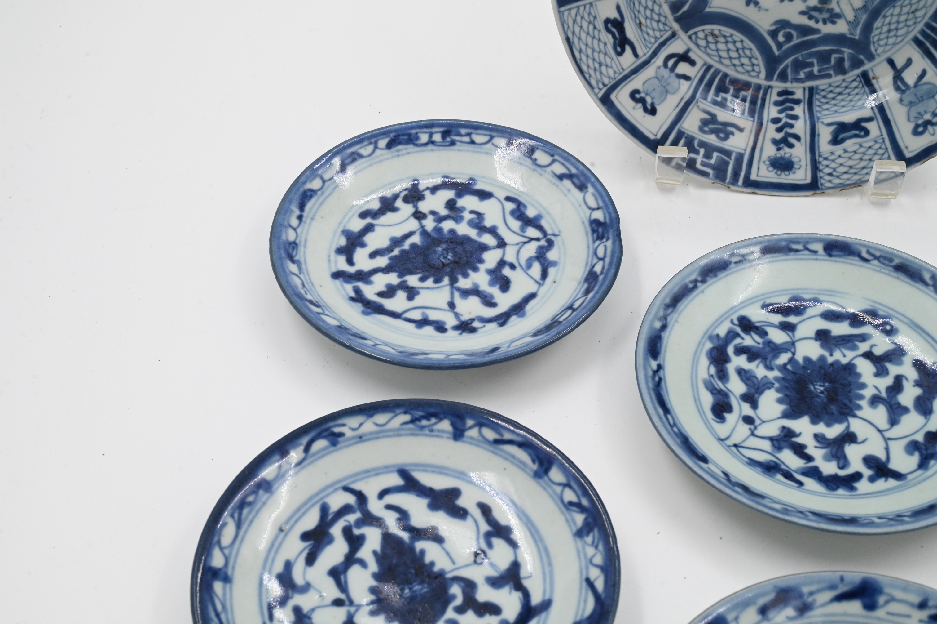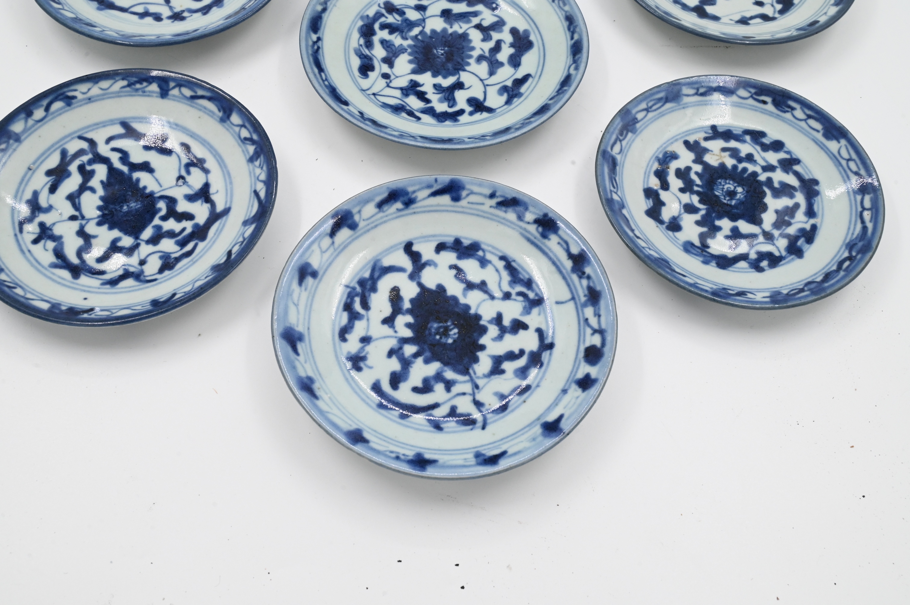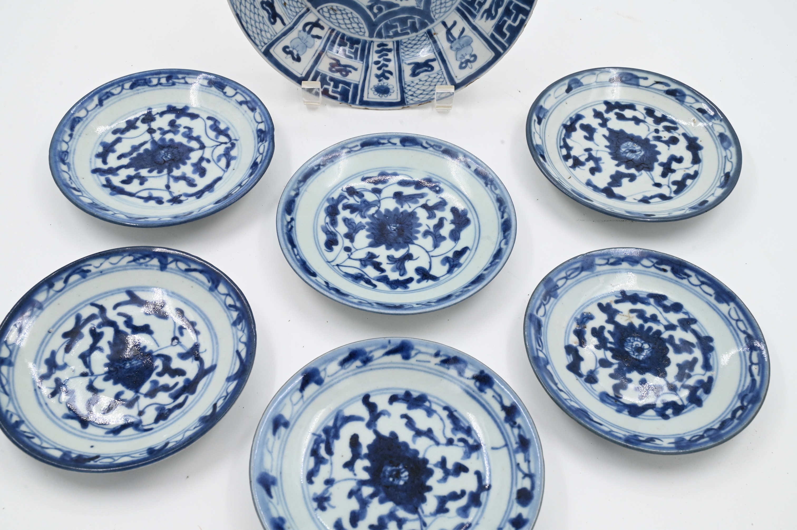 to include set of six Chinese blue and white porcelain small plates, along with one larger plate, each having scrolling flower and vine motif, 18th to 19th century