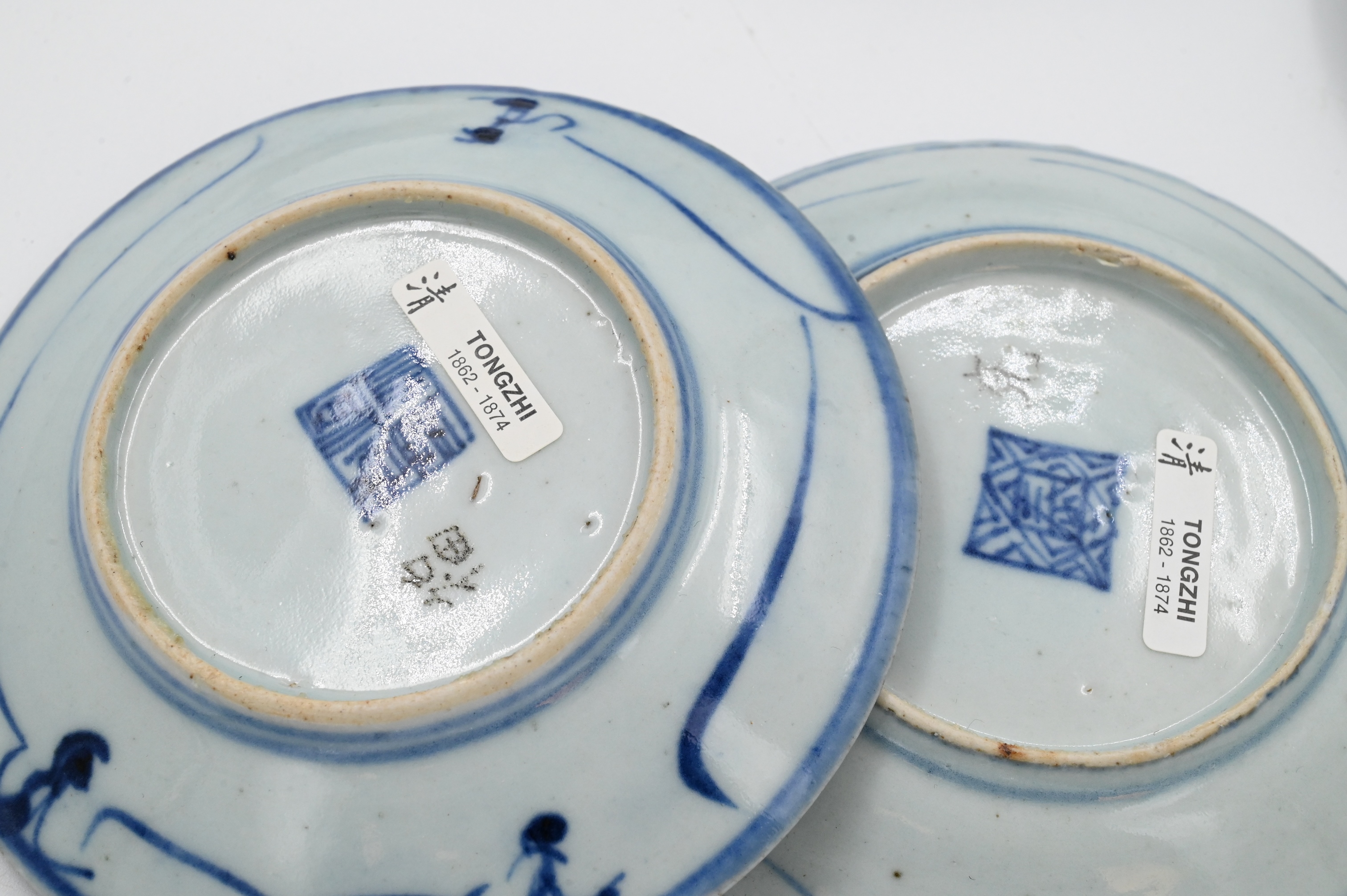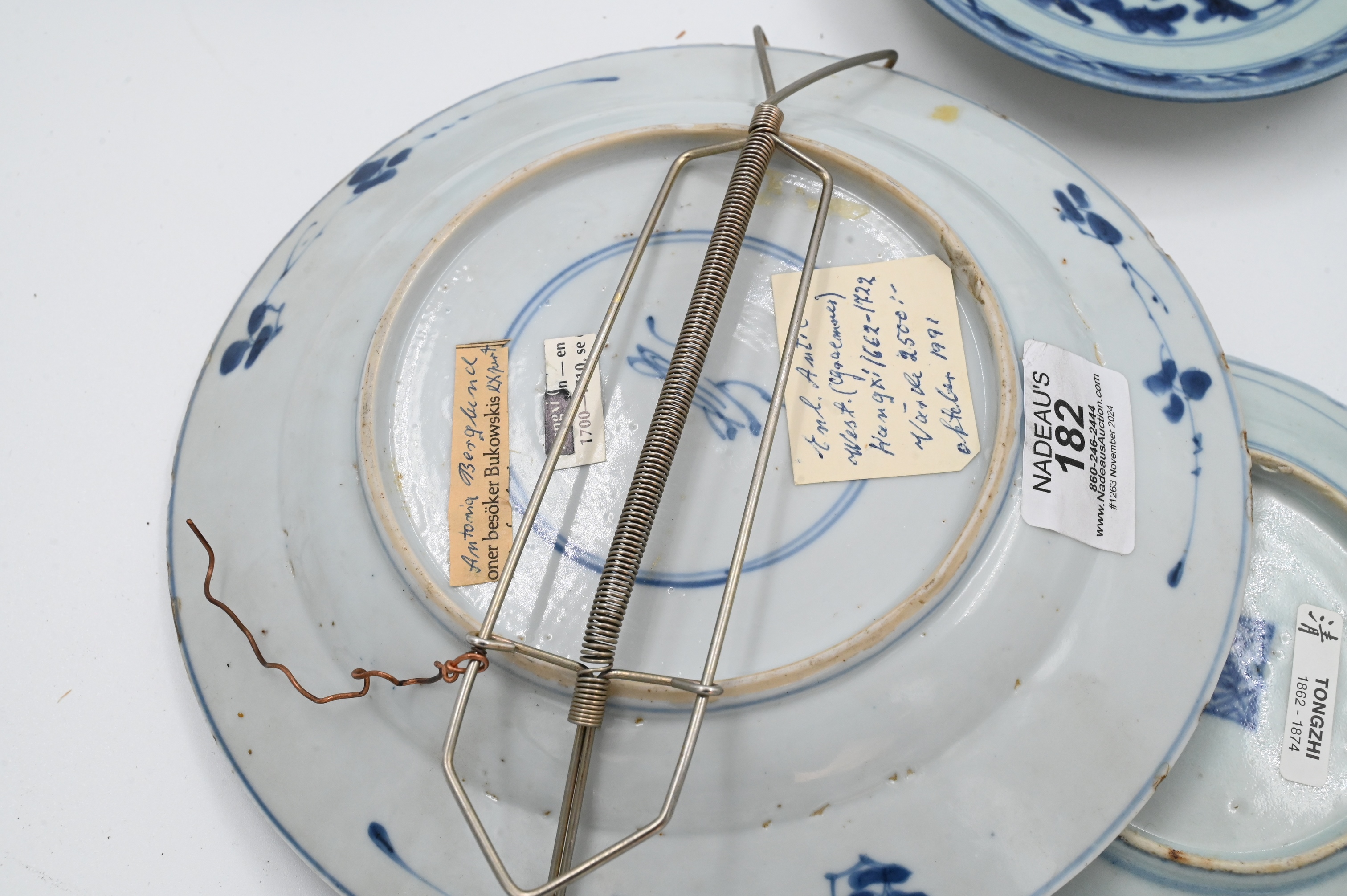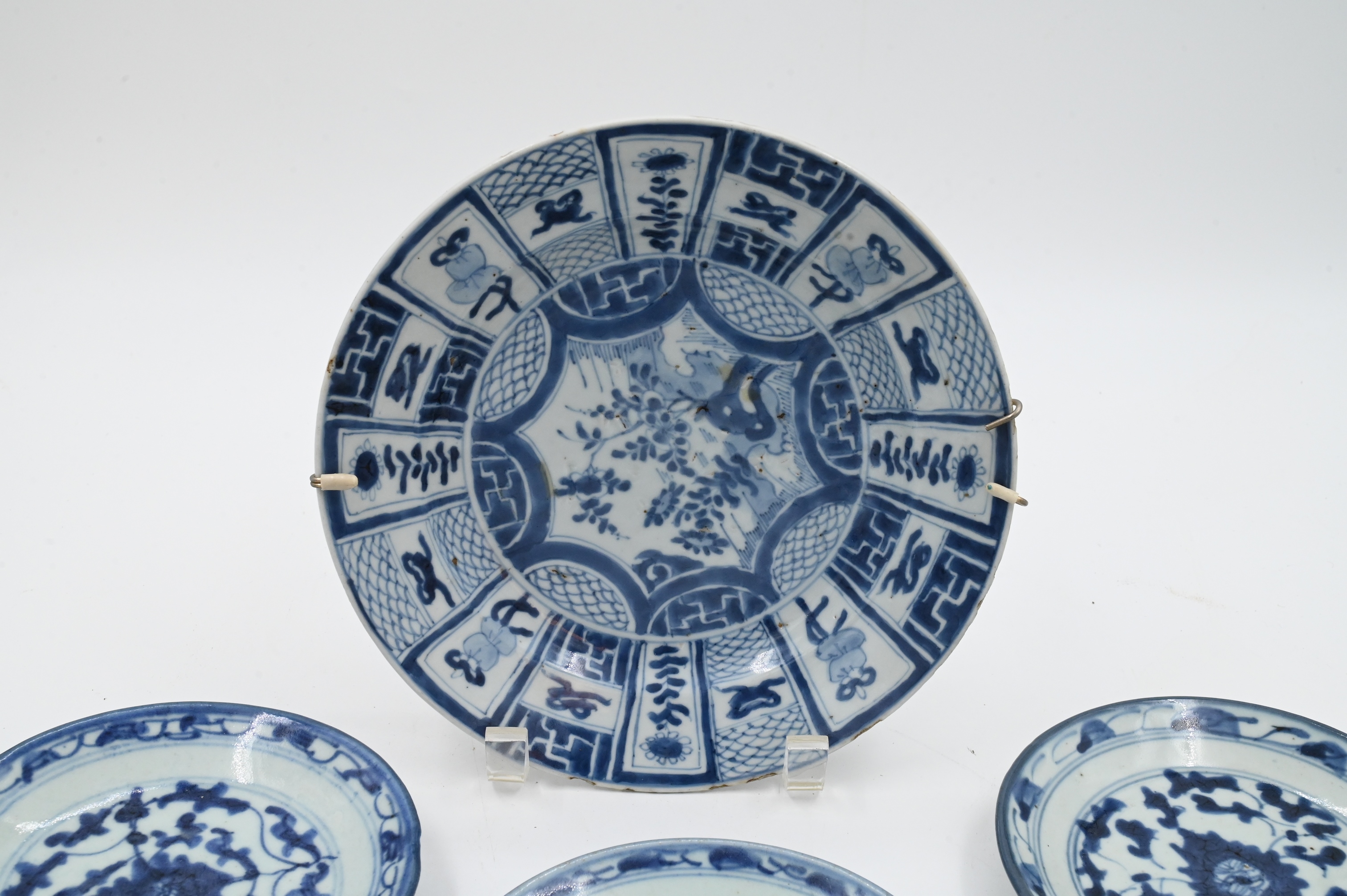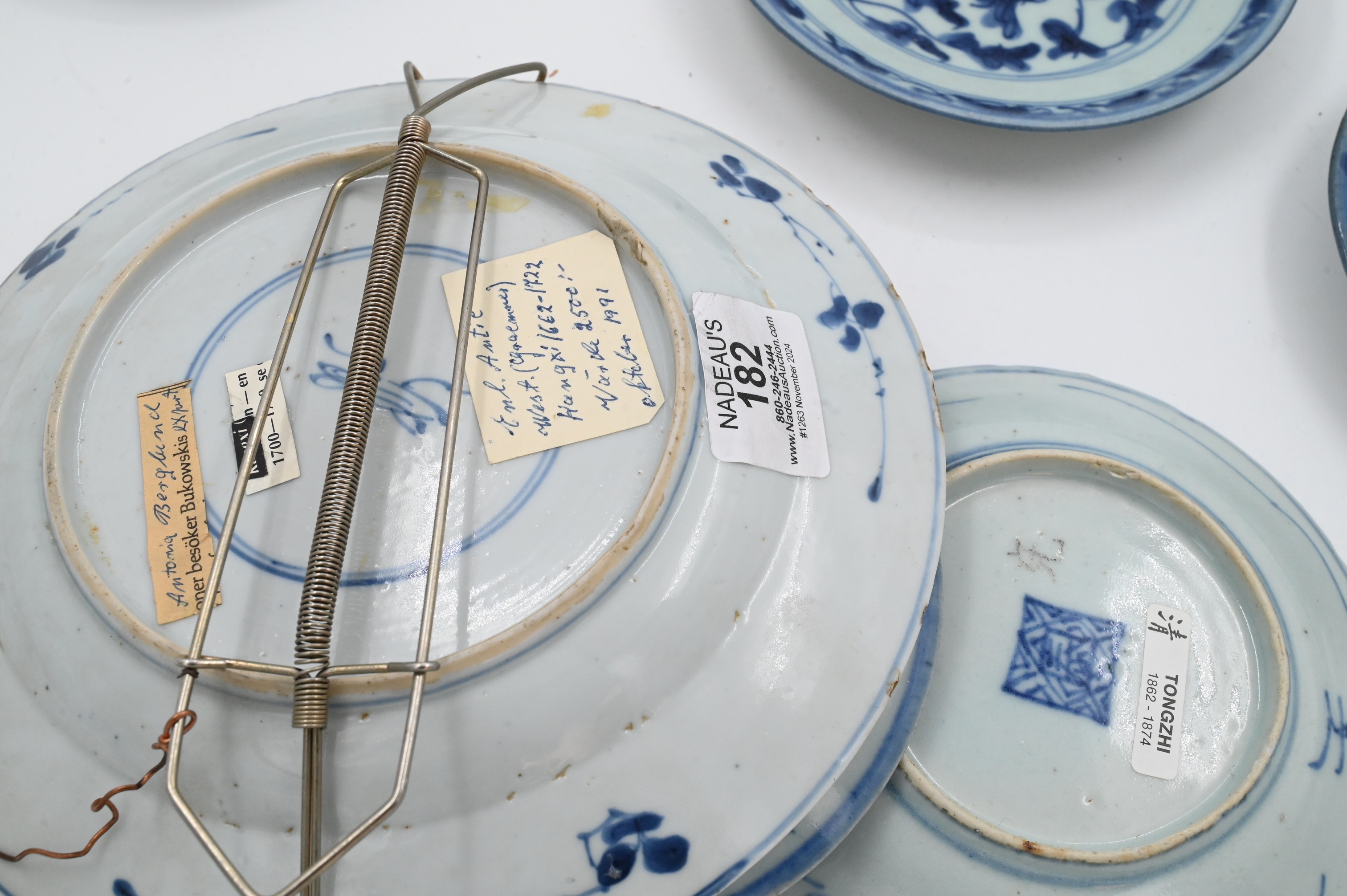 to include set of six Chinese blue and white porcelain small plates, along with one larger plate, each having scrolling flower and vine motif, 18th to 19th century
