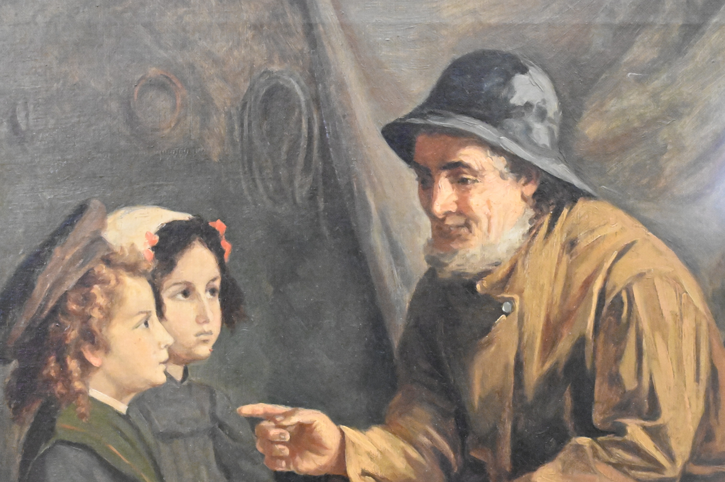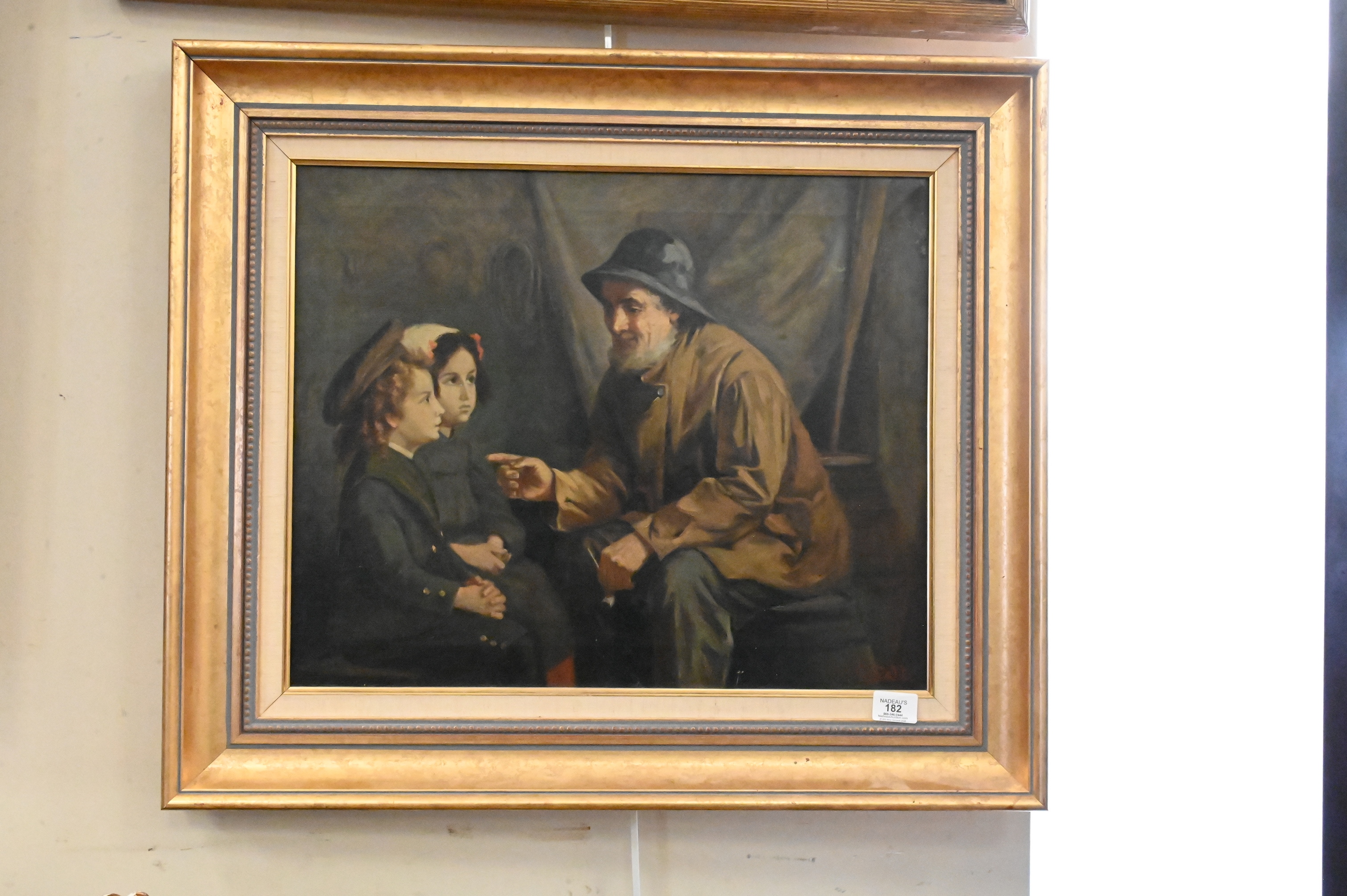 Oil on canvas depicting an elderly fisherman seated beside nets, gesturing while speaking to two young girls seated before him, the figures arranged in a narrative scene within a fishing hut interior