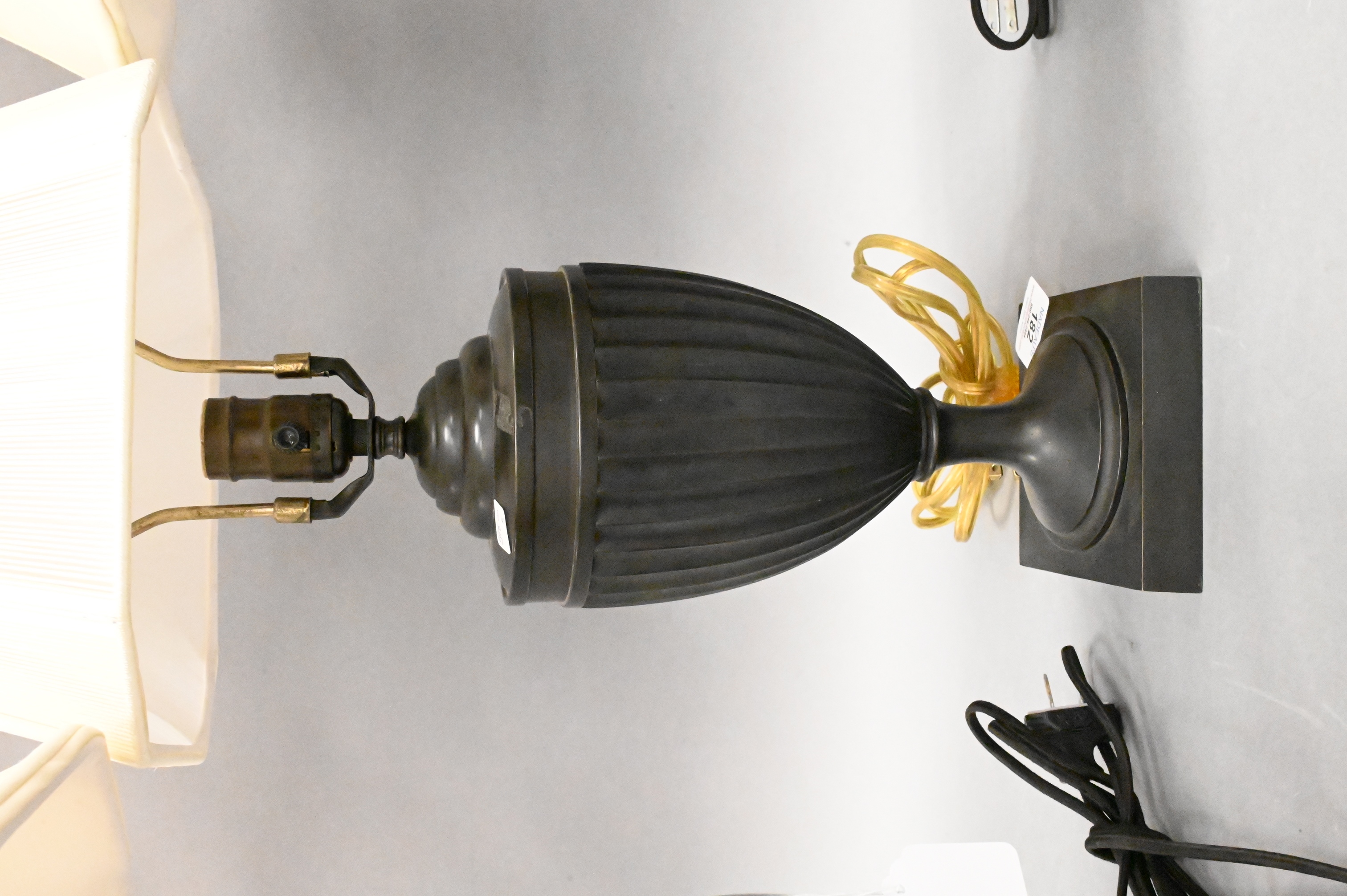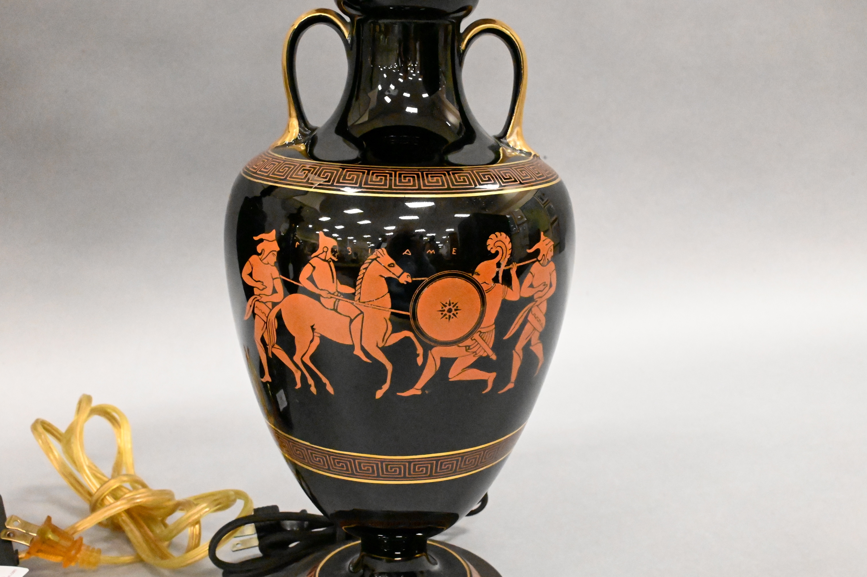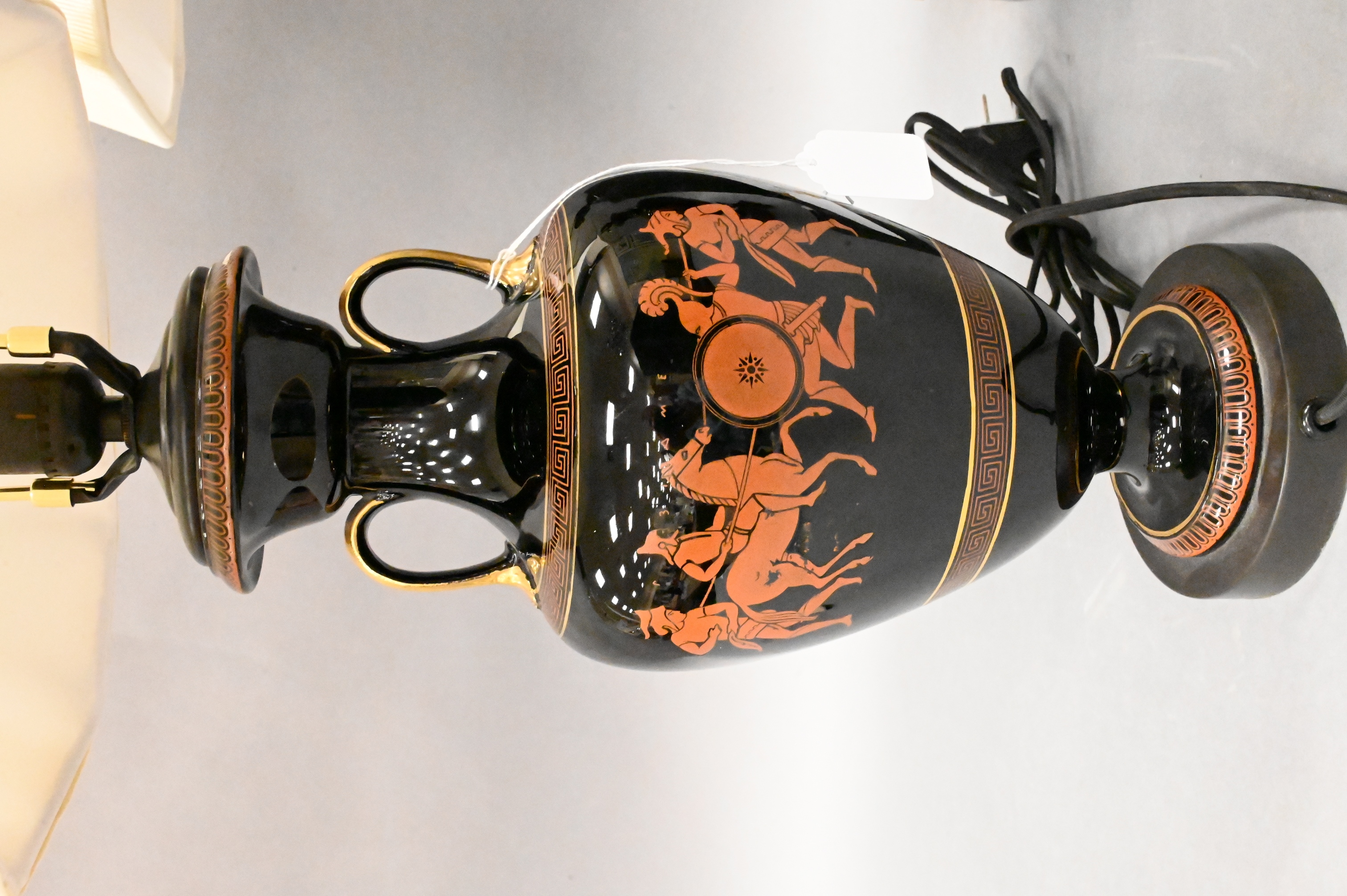 to include pair of vases having red transferware and battle scenes, now mounted as lamps, along with bronze urn shaped lamp