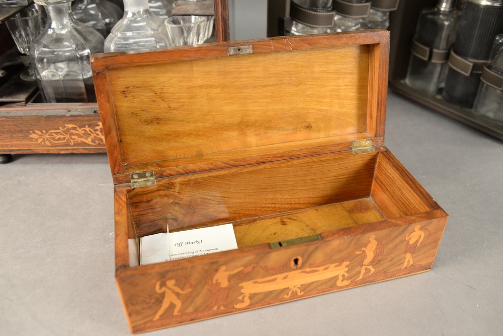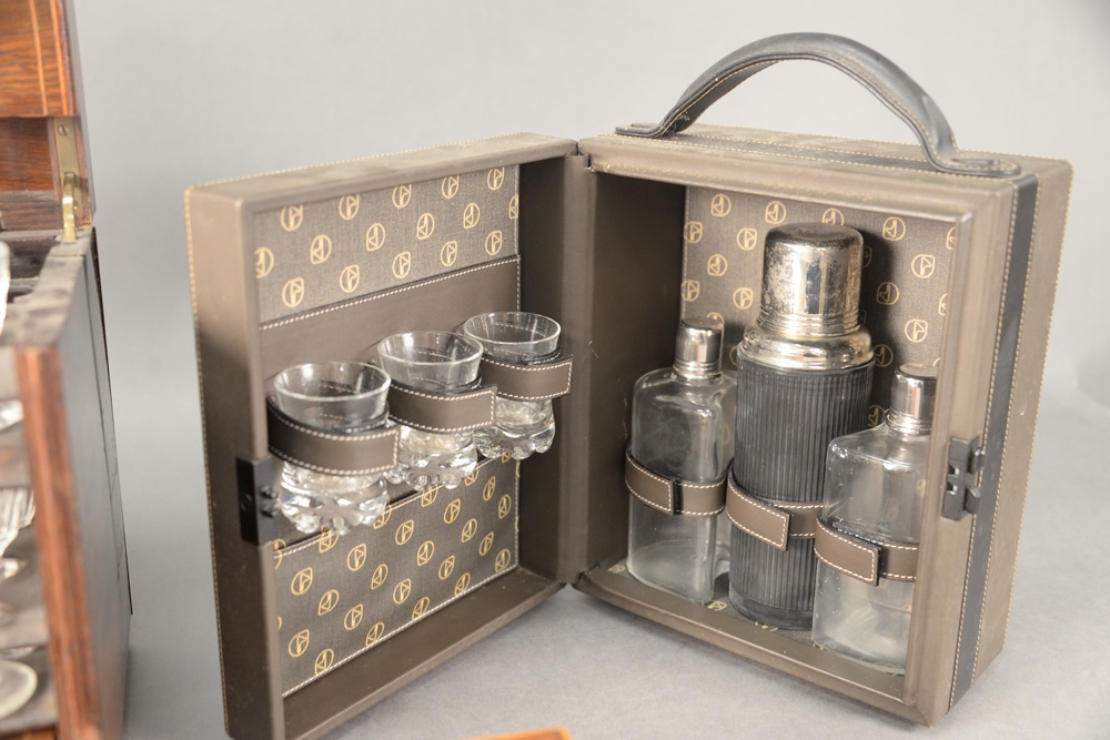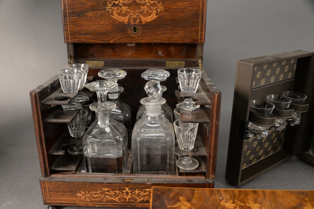 Three Piece Lot, to include two sets of tantalus, one in contemporary box one in an inlaid box, along with an enameled box, height 10 1/2 inches, length 8 1/2 inches, width 11 1/ 2 inches.