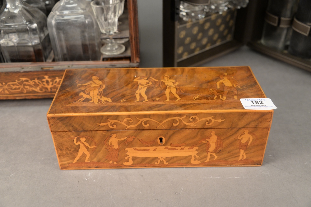 Lot 182: Three Piece Lot, to include two sets of tantalus, one in contemporary box one in an inlaid box, along with an enameled box, height 1…