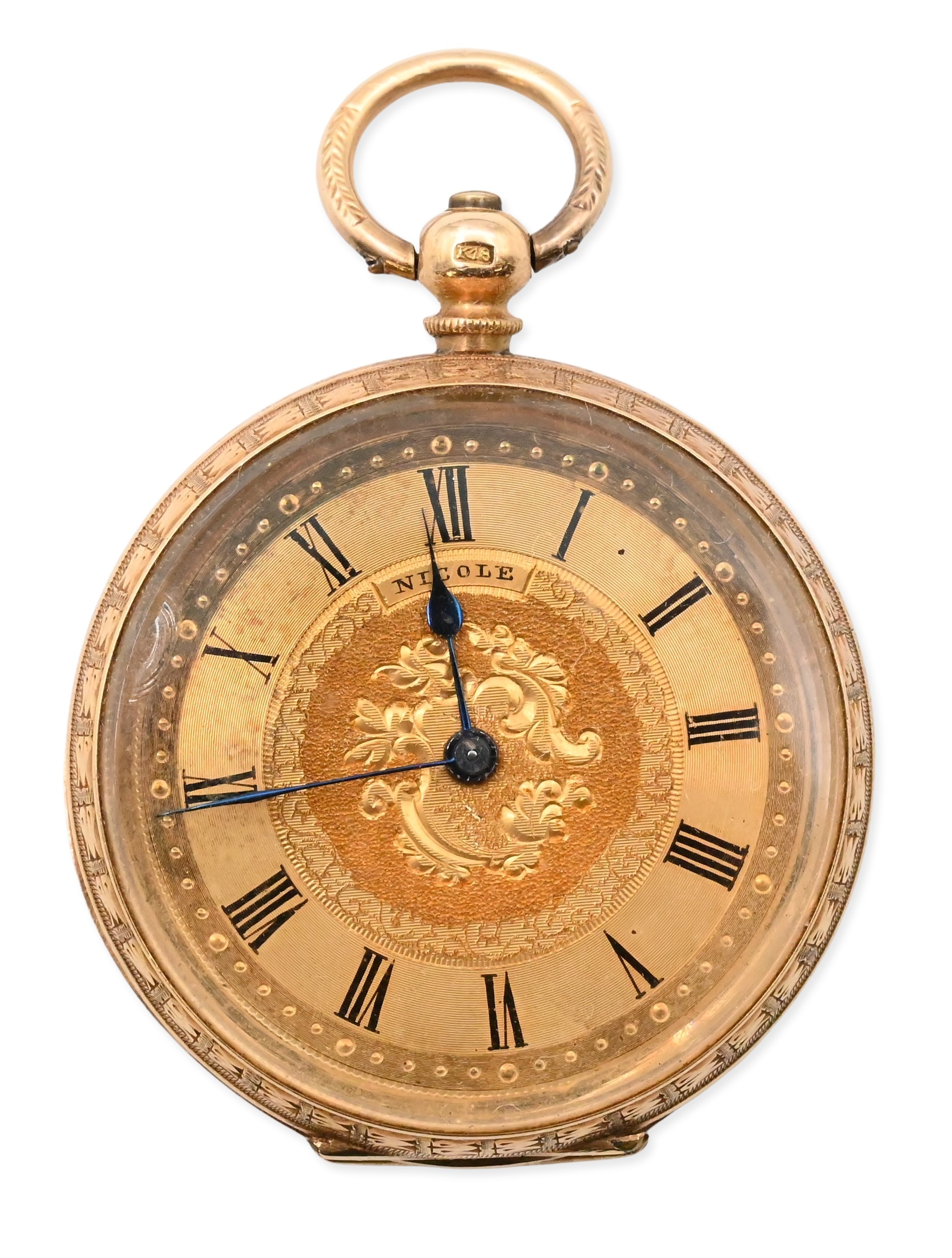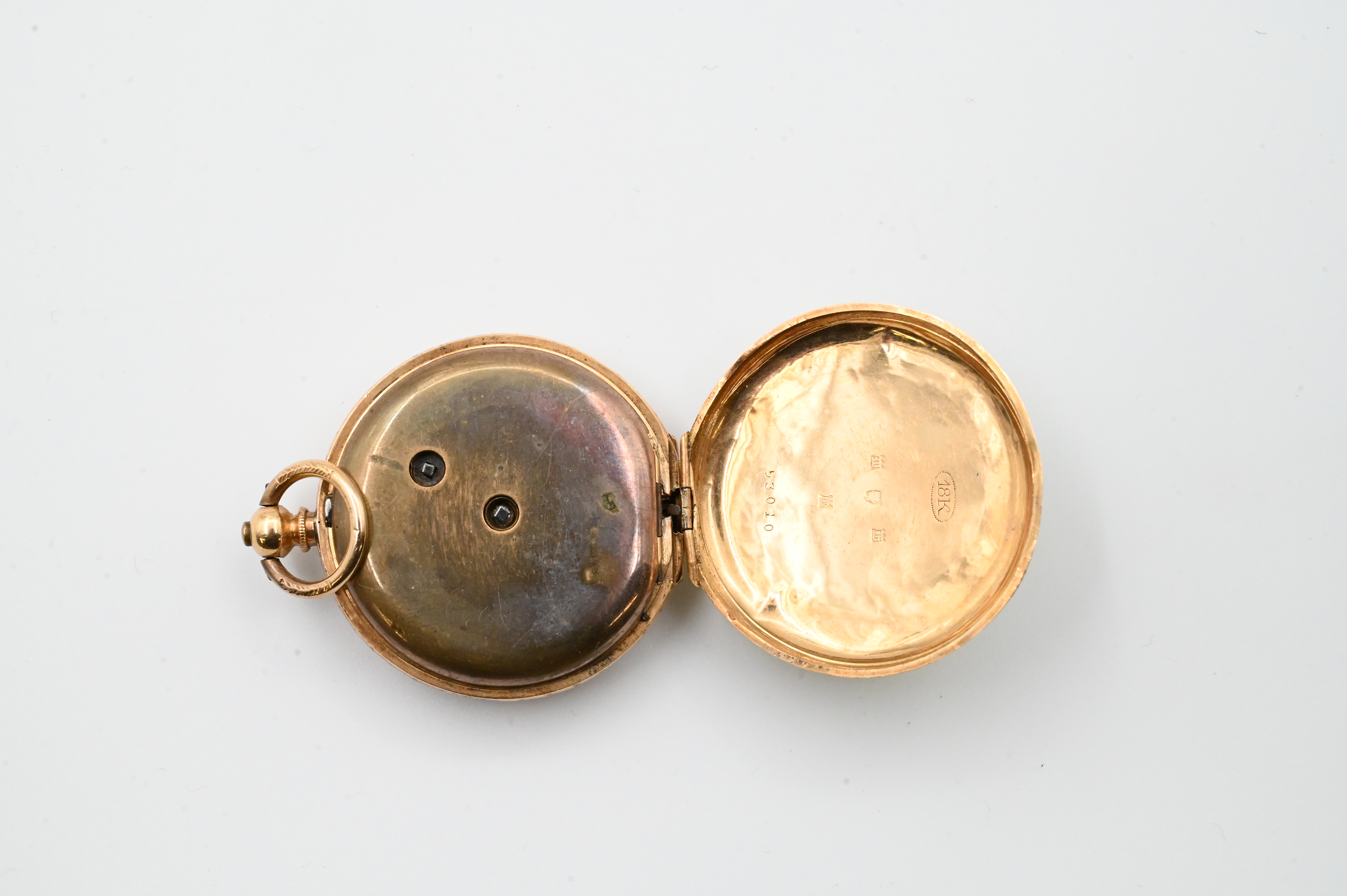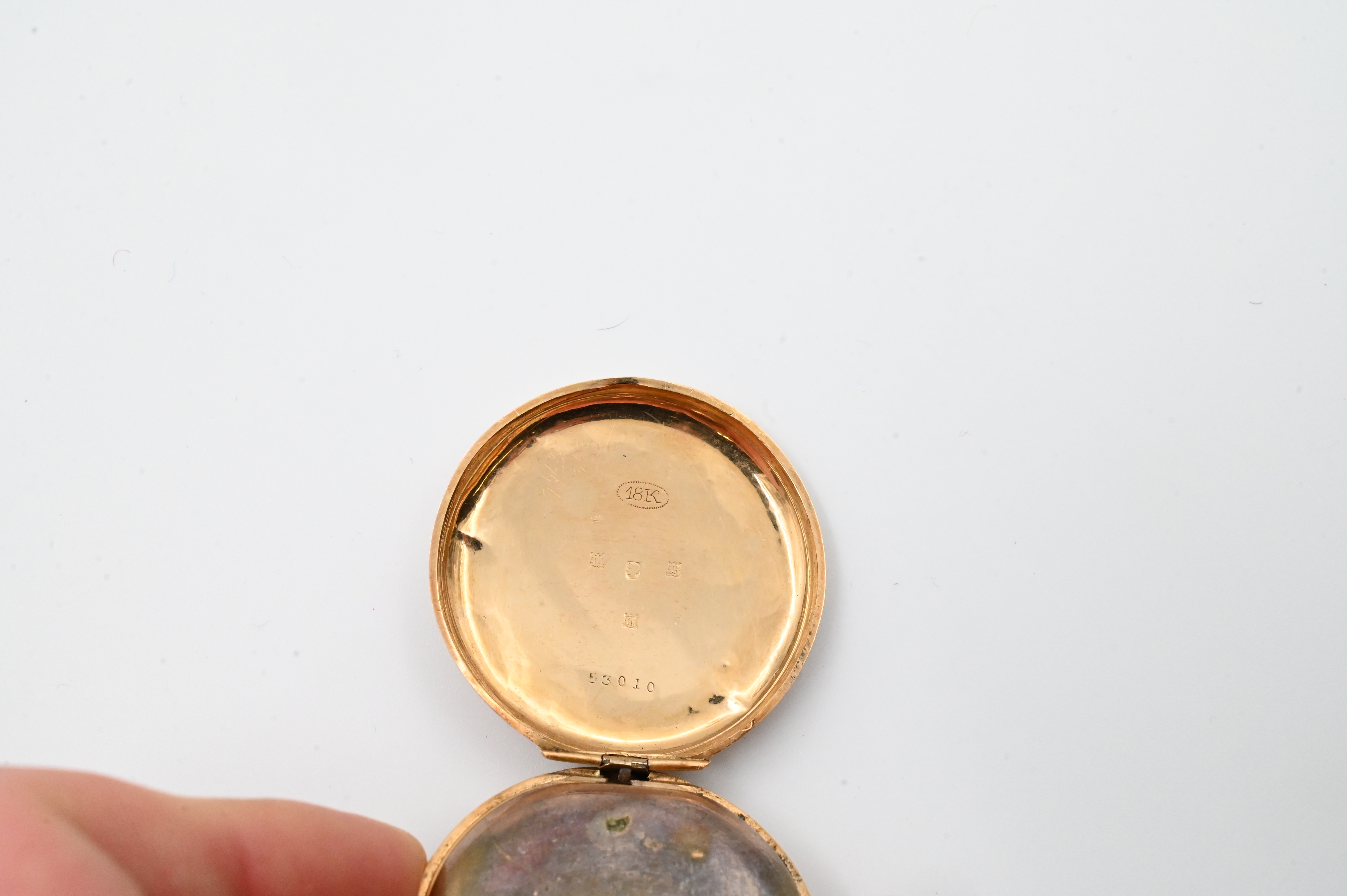 36.2mm case diameter; outer case marked 18k, inner cuvette stamped “cuivre” (base metal); key wind movement with blued screws, engraved balance bridge, and Roman numeral dial with engine-turned center