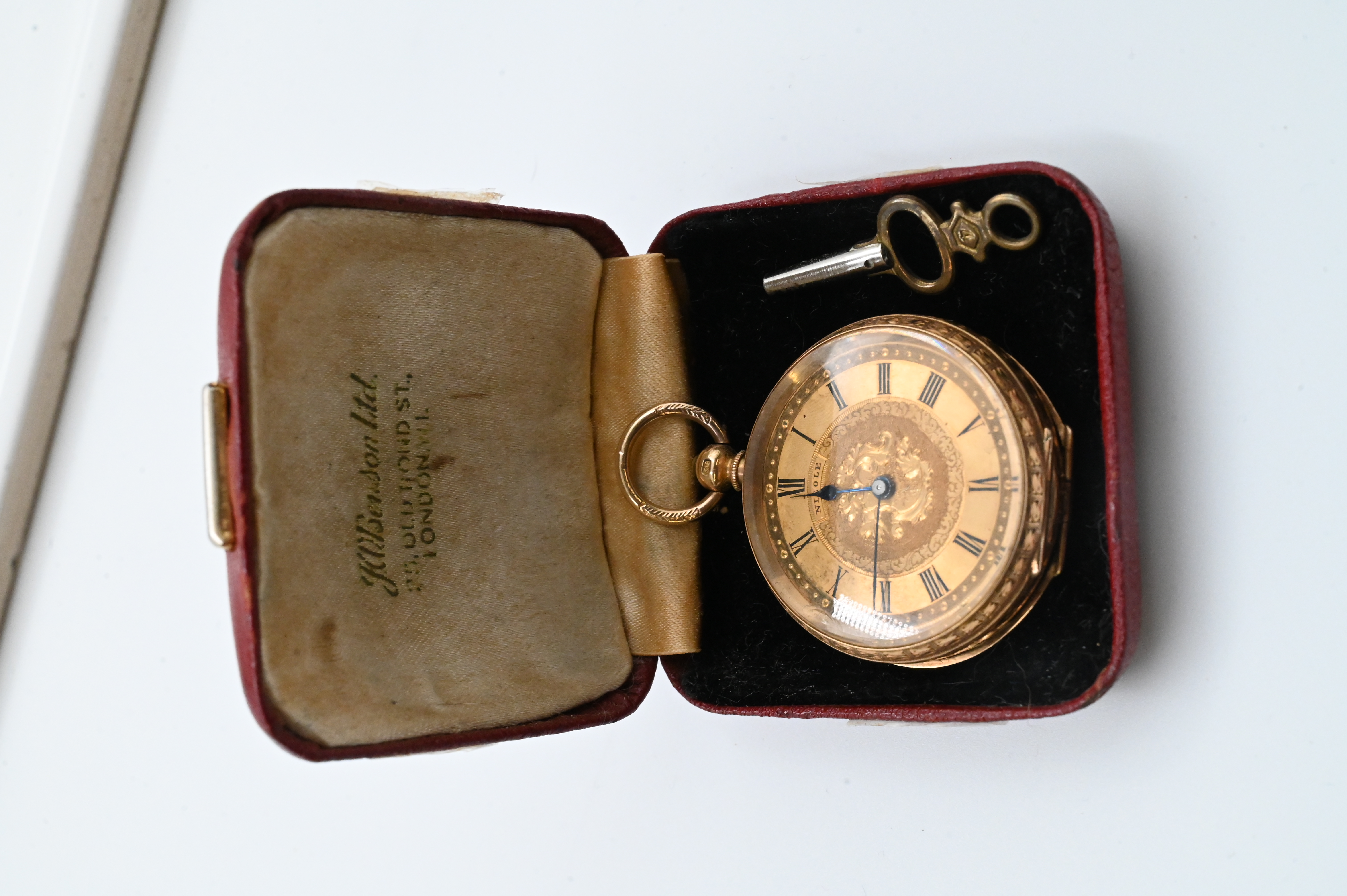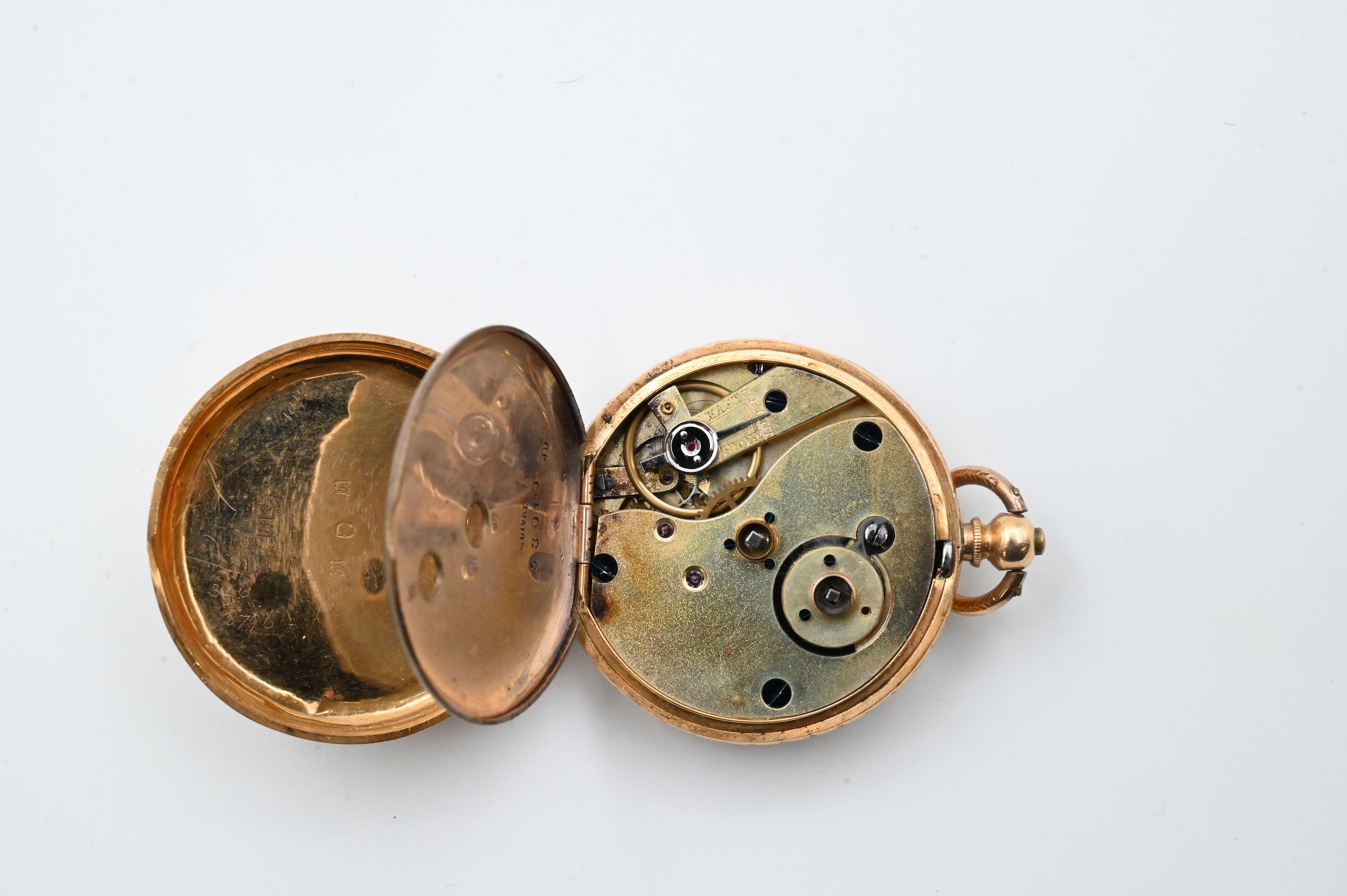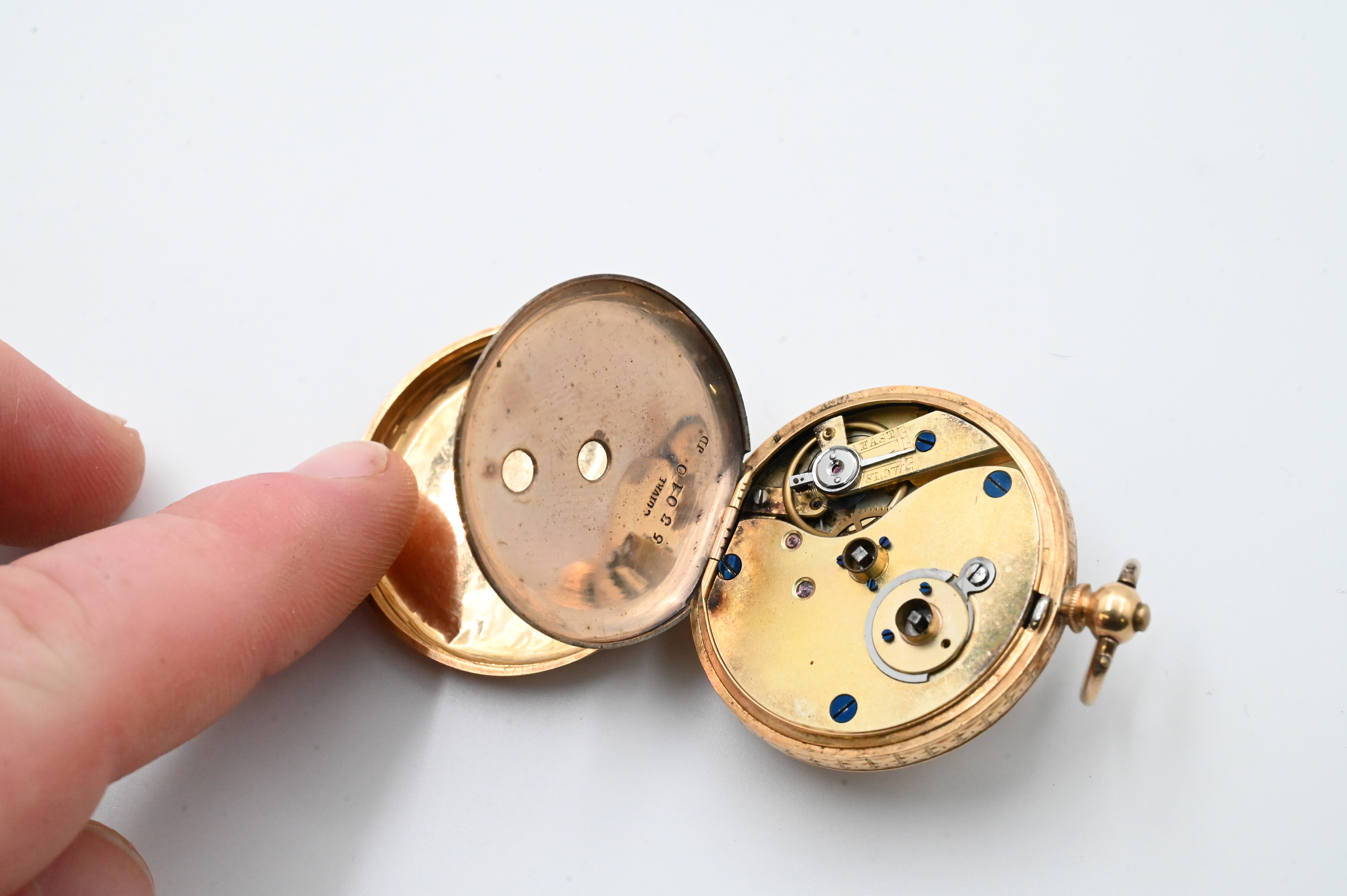 36.2mm case diameter; outer case marked 18k, inner cuvette stamped “cuivre” (base metal); key wind movement with blued screws, engraved balance bridge, and Roman numeral dial with engine-turned center