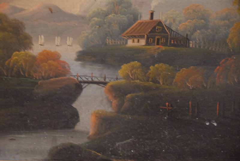 19th century landscape of house overlooking river in Victorian frame, 17 1/2 x 22 1/2.