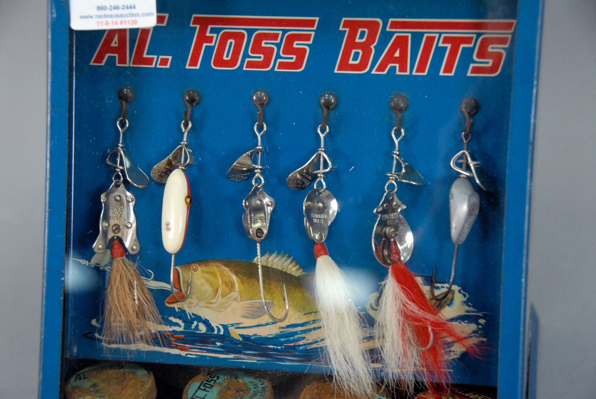 Lot 183: Al Foss Bait Selling advertising cabinet marked Al Foss Pork Rind Baits True Temper Rods with six lures, original boxes, and jars.