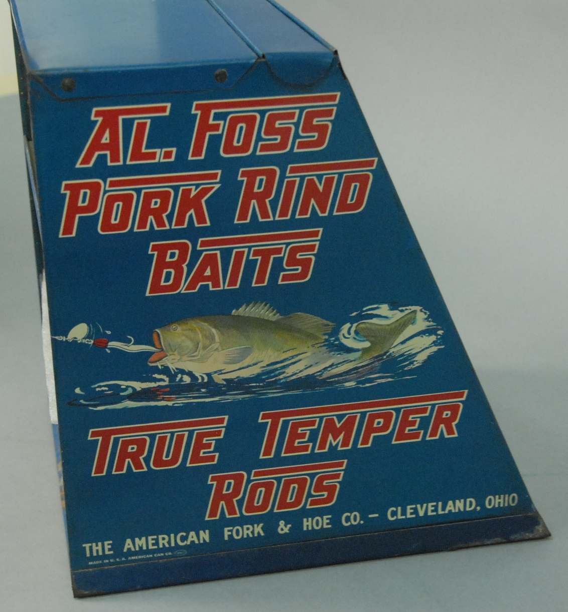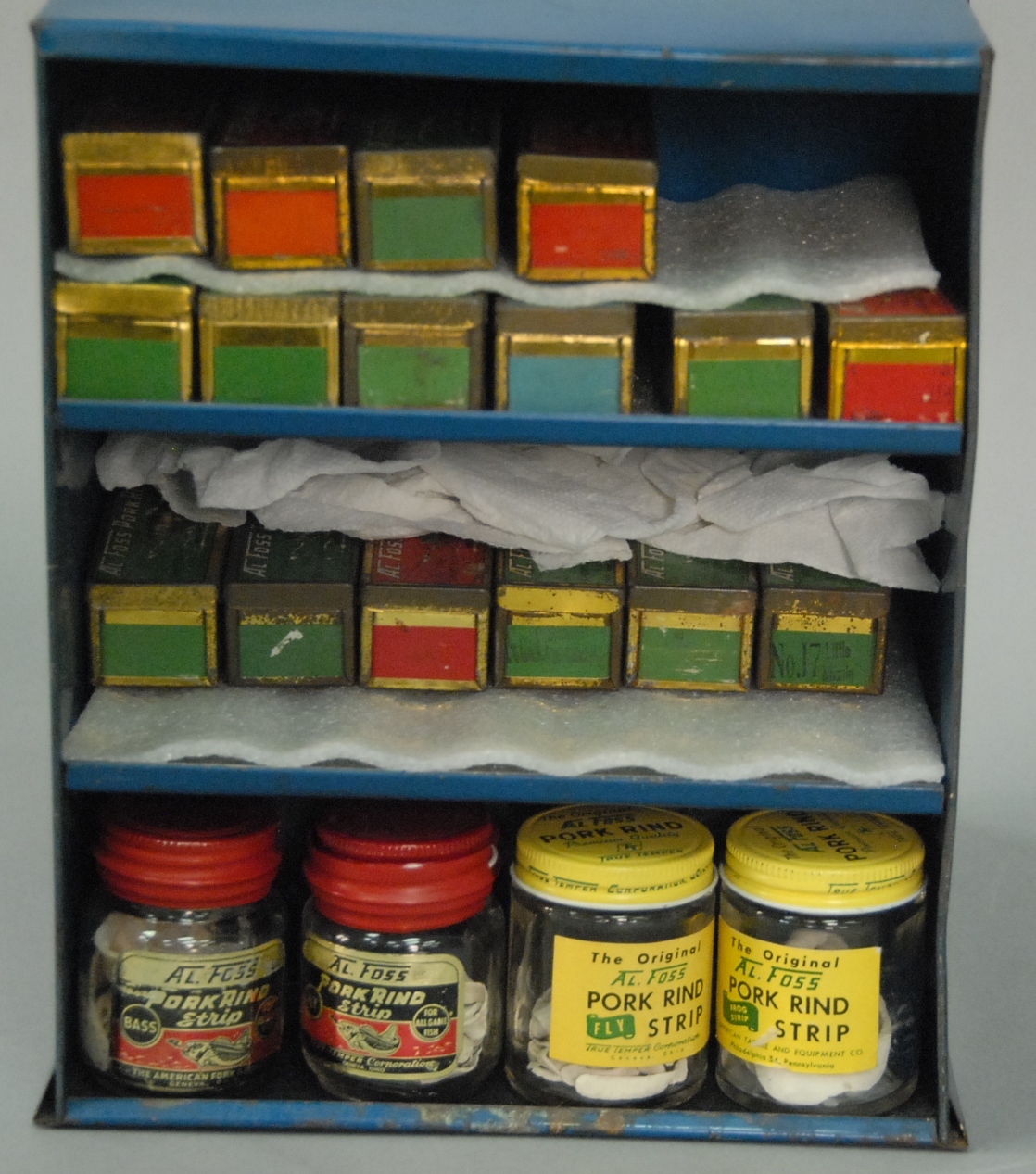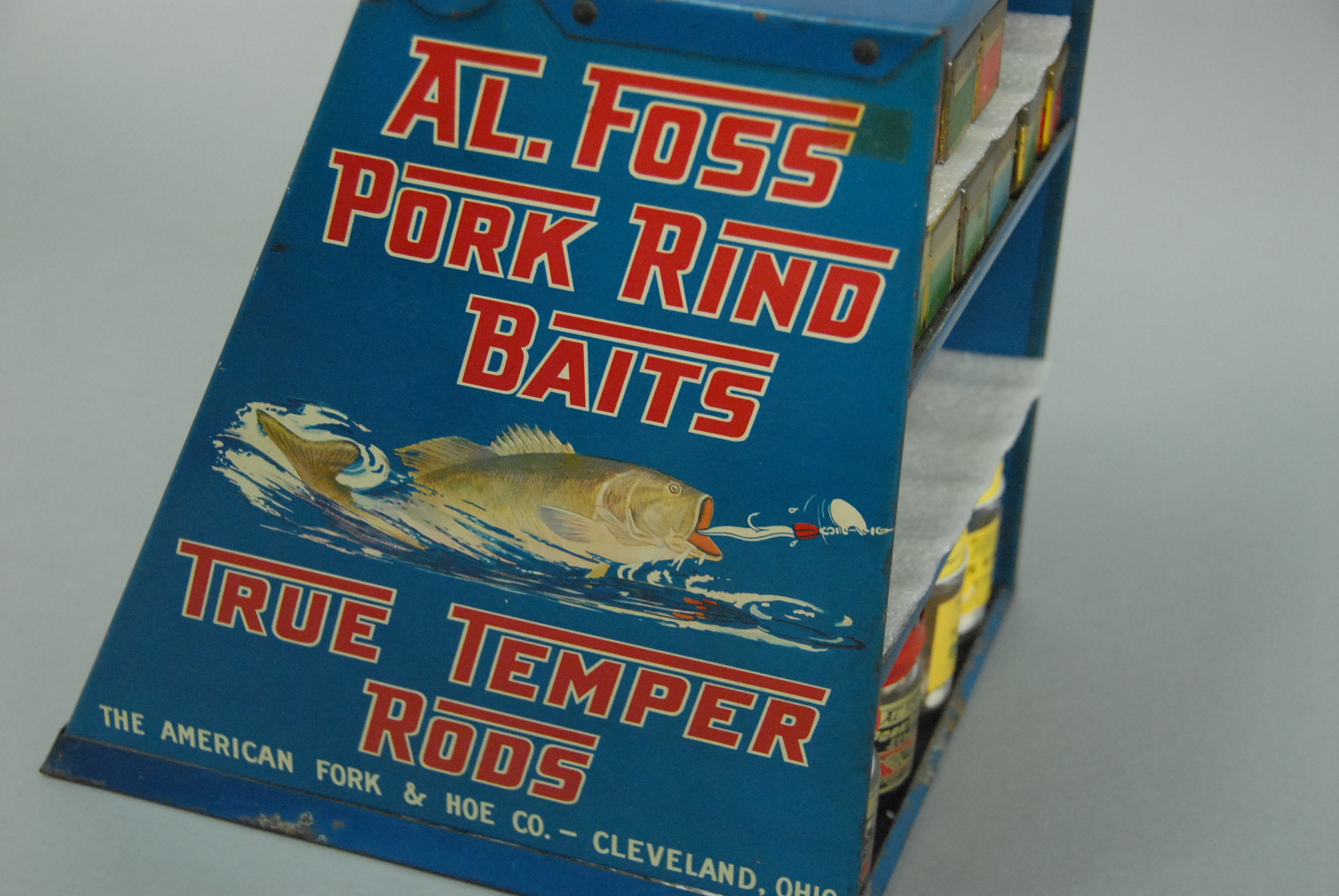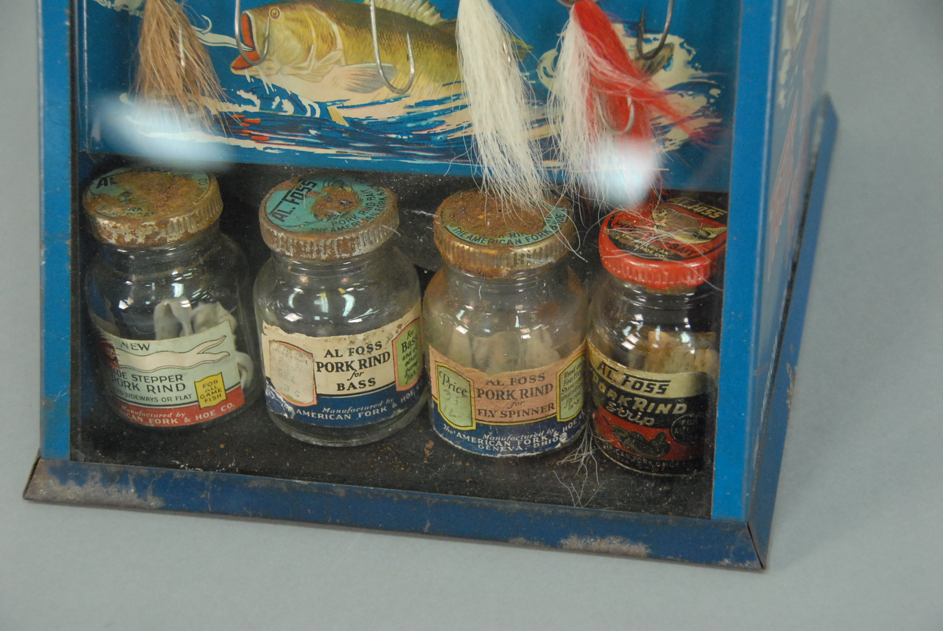 Al Foss Bait Selling advertising cabinet marked Al Foss Pork Rind Baits True Temper Rods with six lures, original boxes, and jars.