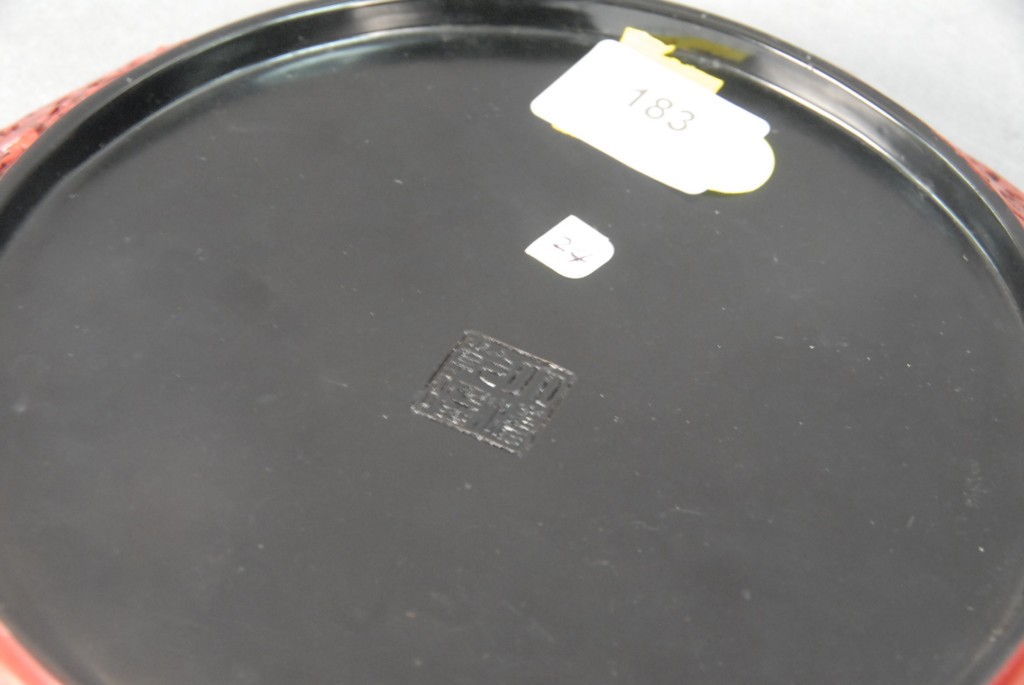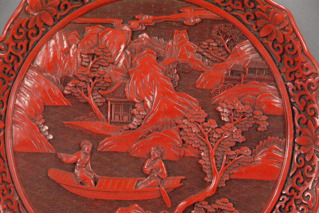 Cinnabar lacquered plate with relief landscape, dia 9 1/2