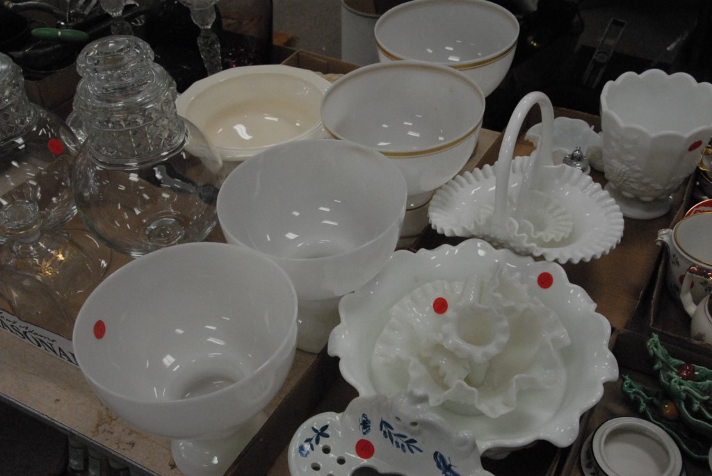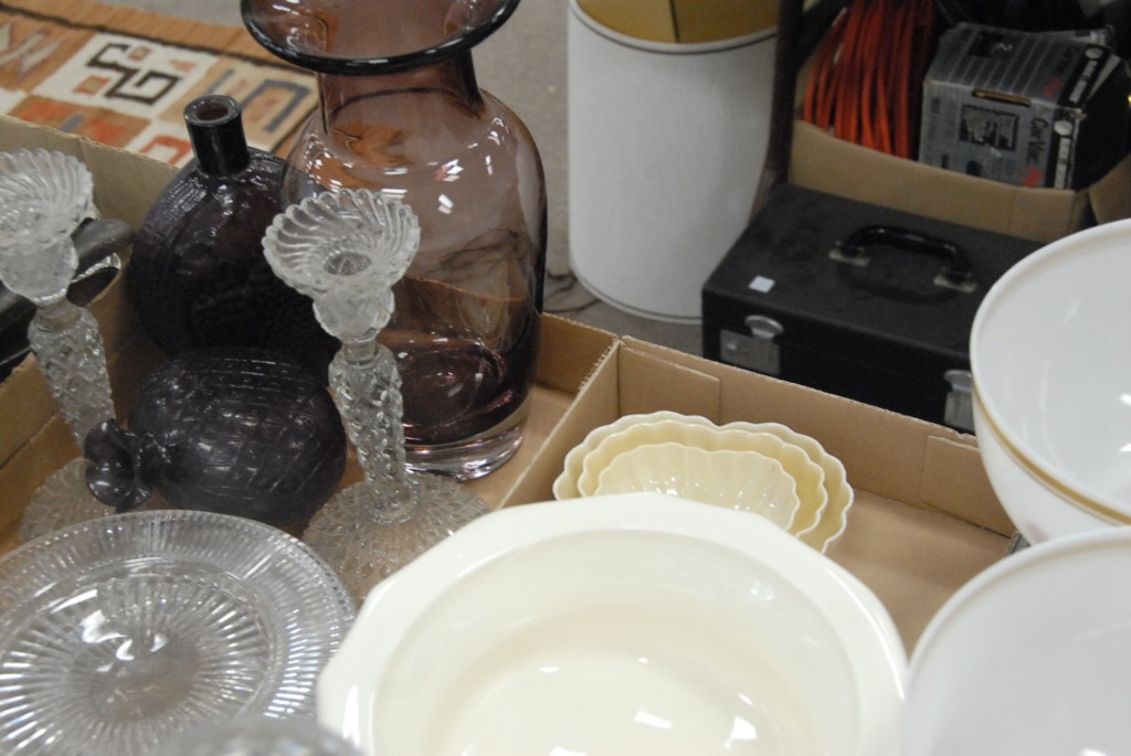Five box lots plus two pairs of large vases milk glass, Bristol glass, cut crystal plates, pressed glass, candlesticks, pressed glass jars, early decanter, three Belleek shell heart shaped dishes.