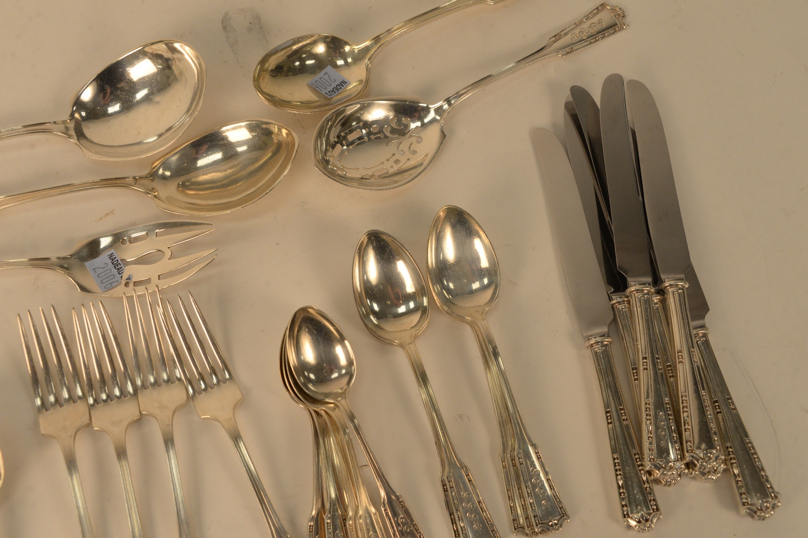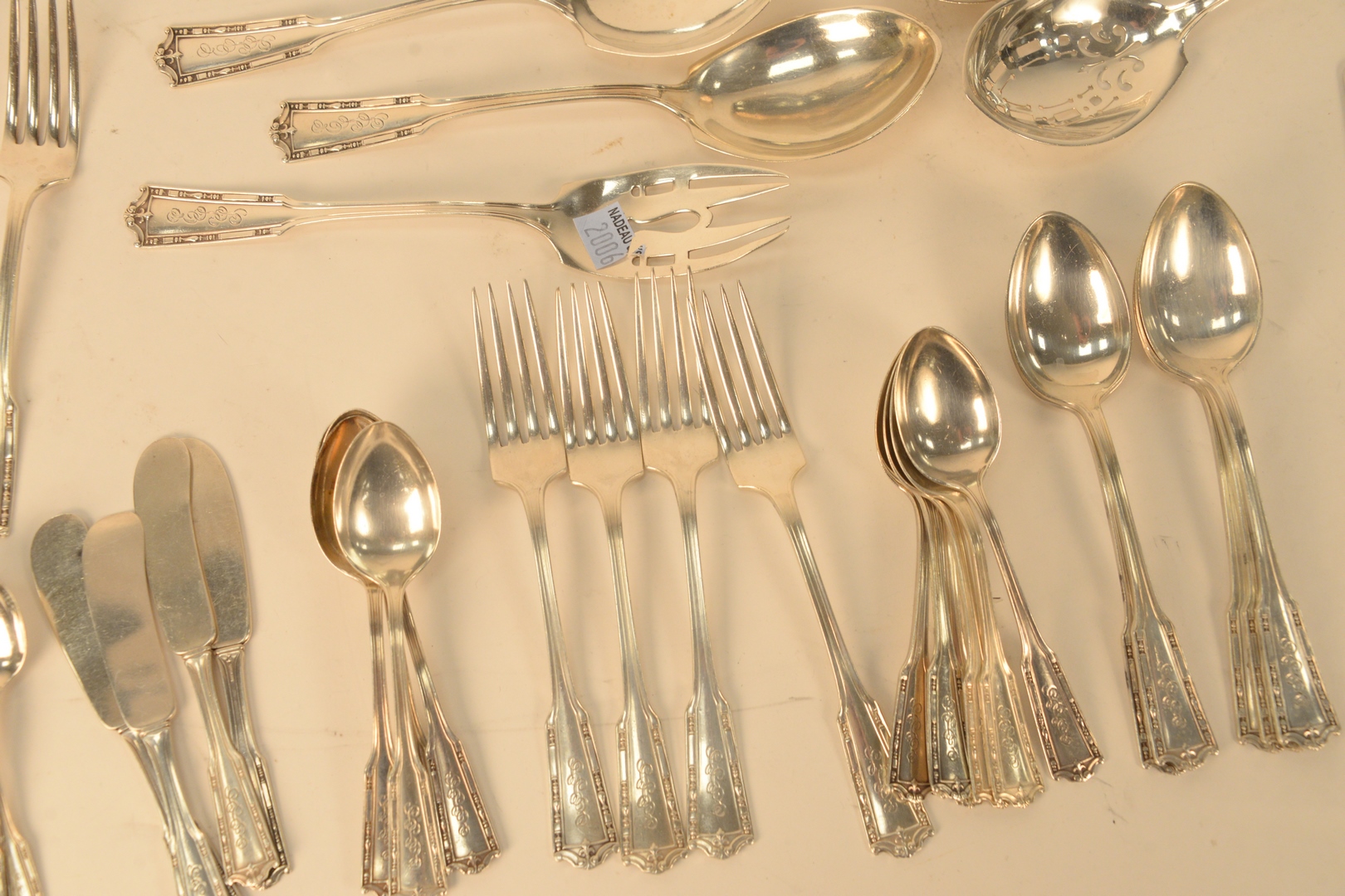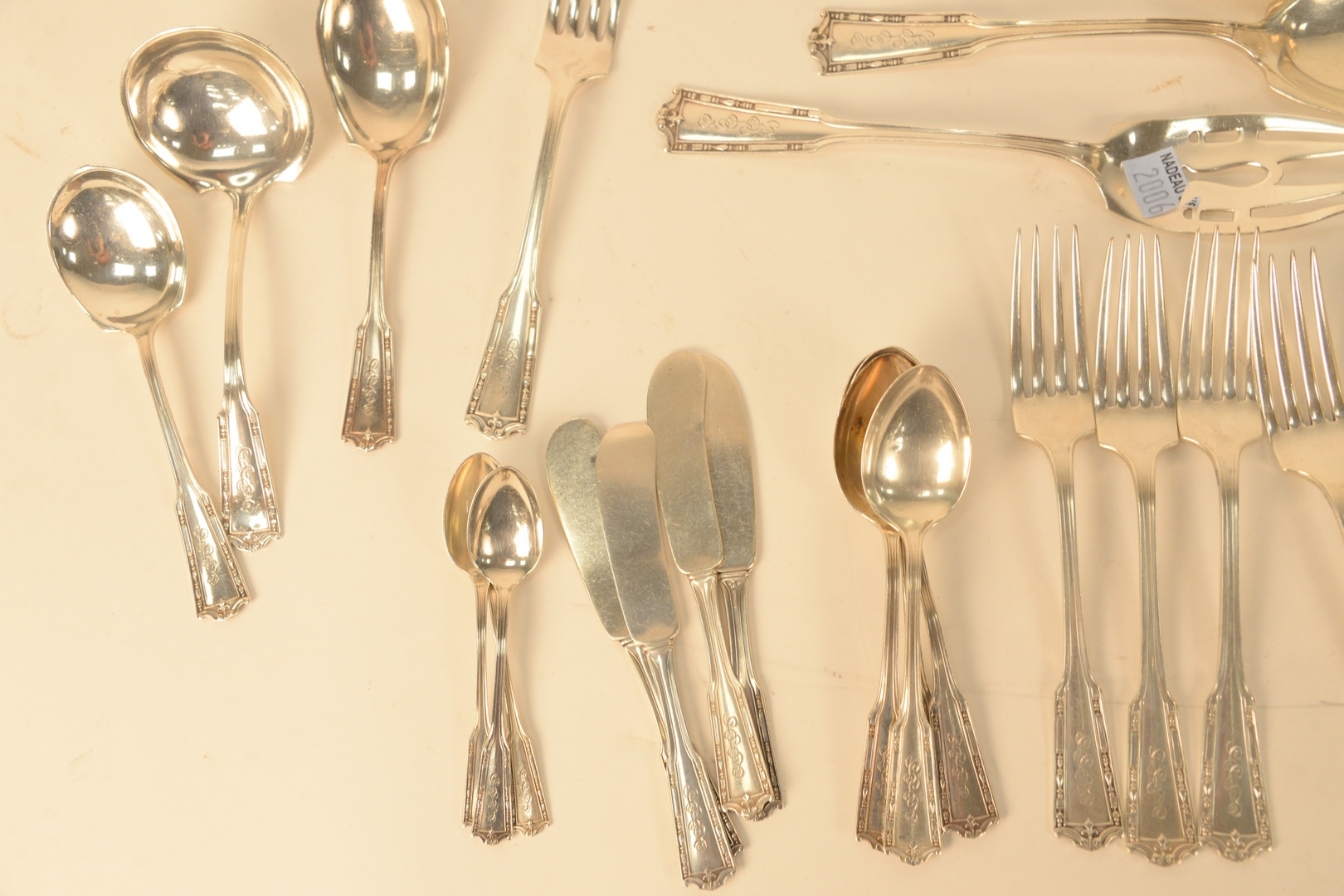 Forty-three piece Sterling Silver Flatware Set, including serving pieces, 46.9 t.oz. plus six handles. Provenance: The Estate of Gloria Schiff, 630 Park Avenue, New York.