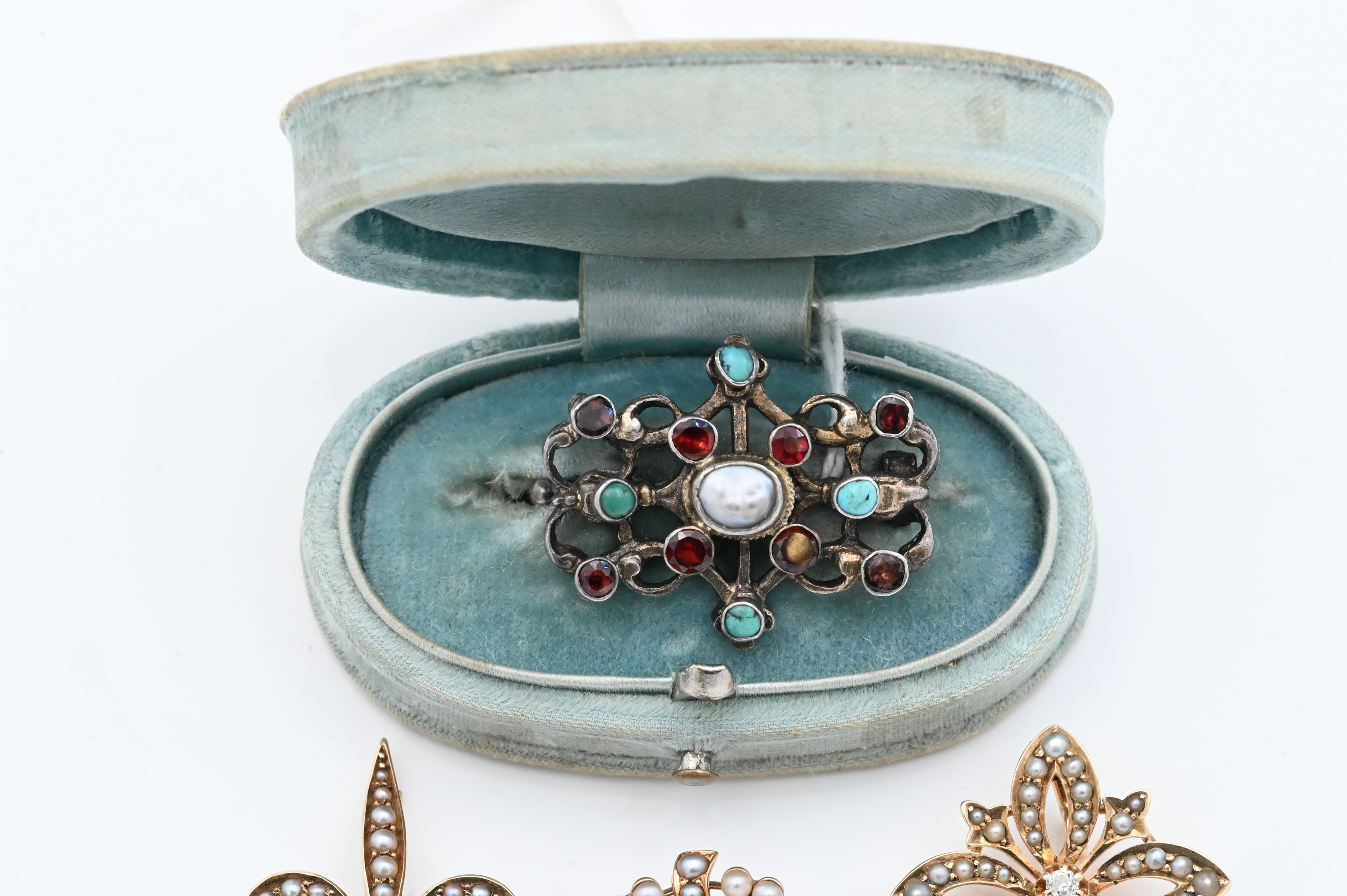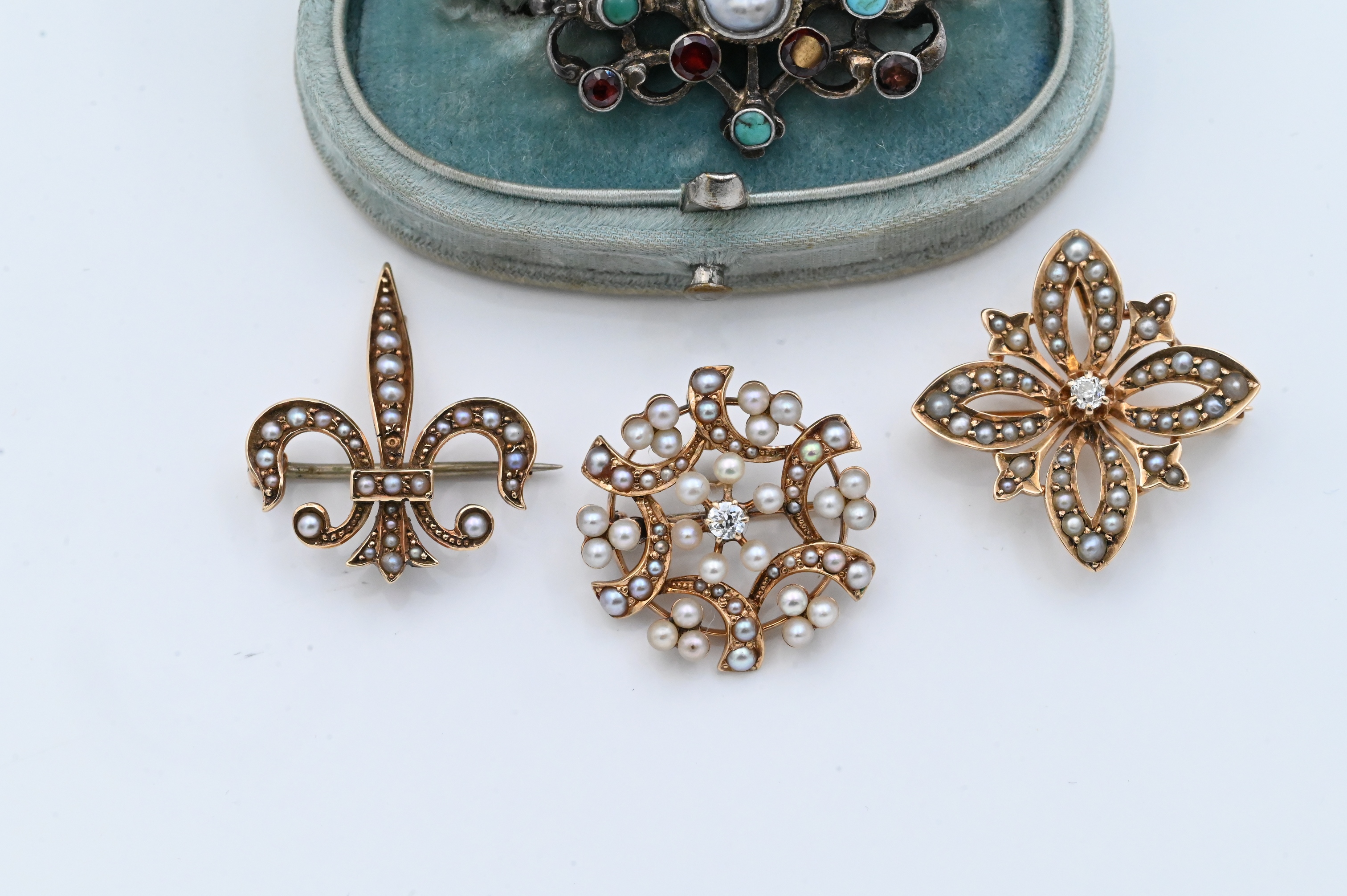 Including a fleur-de-lis form brooch, pearl floral form brooch centering a small diamond, 10k white gold brooch of openwork scroll design set with turquoise cabochons, round garnet stones, and a central pearl; unmarked.