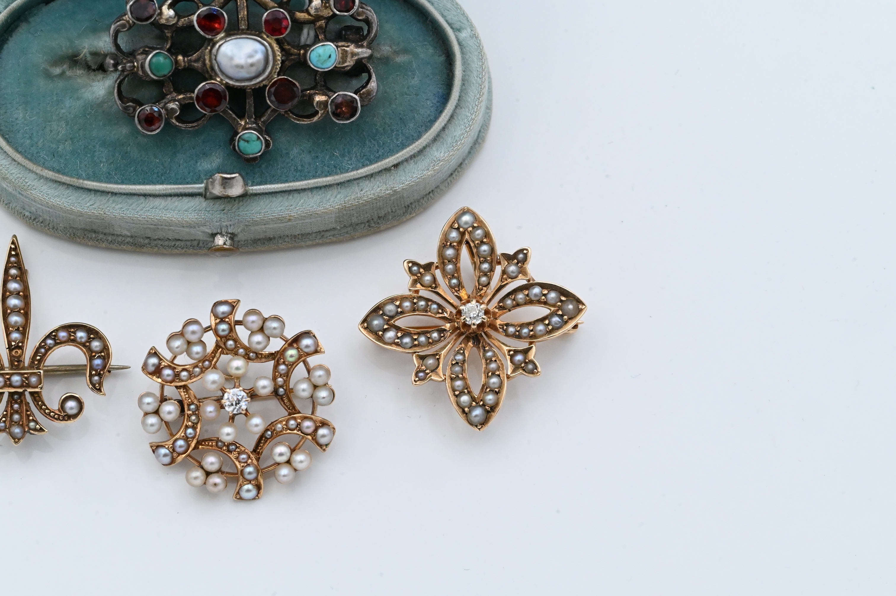 Lot 183: Four 14K Yellow Gold Victorian to Edwardian Style Seed Pearl Brooches