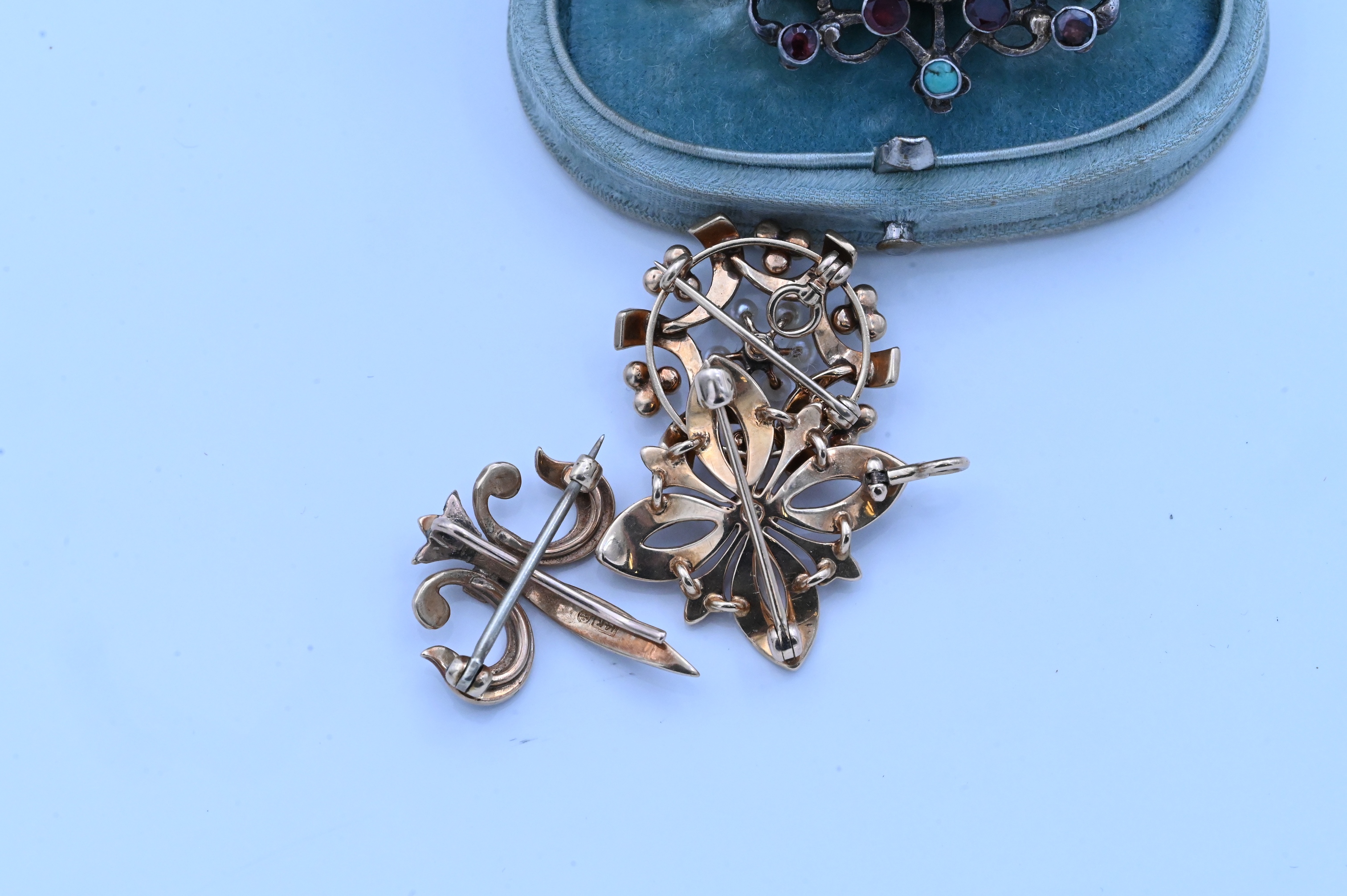 Measures 1 × 1¼ inches; total weight 6.3 grams., and a circular floral brooch accented with seed pearls and small diamonds; two marked “14K.