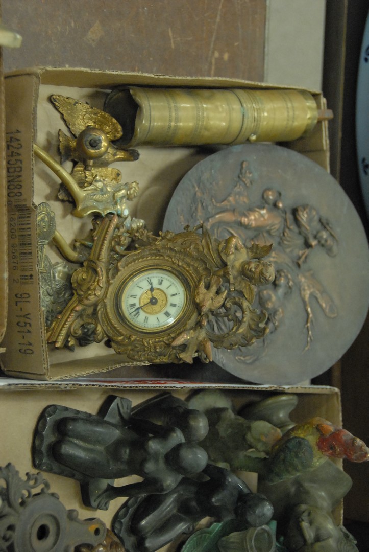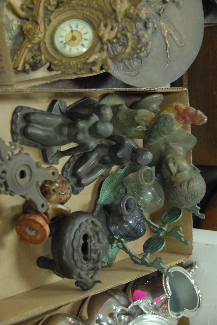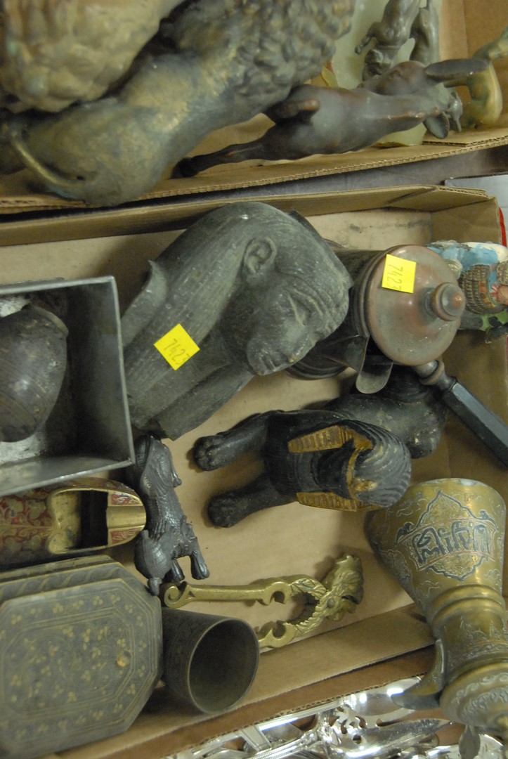 Lot 183: Four box lots of bronze, metal, copper, and brass items to include bookends, iron bird, bronze censors, copper plaque, lions, dog fi…