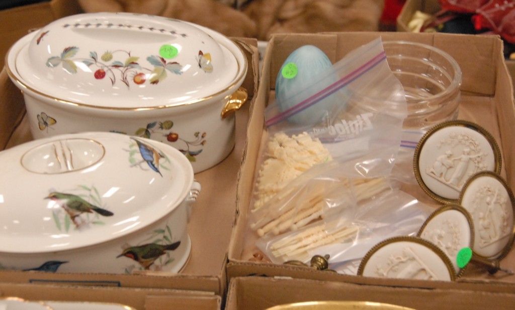 Four box lots ovenware, three Staffordshire miniature plates, and three pairs of curtain tiebacks including two early enameled ones.