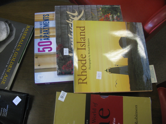 Group of coffee table books including New Wine Atlas, The World of Wine, Rhode Island, Smithsonian Baseball, etc.