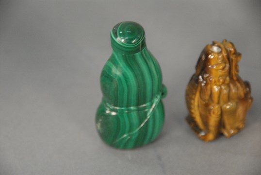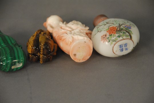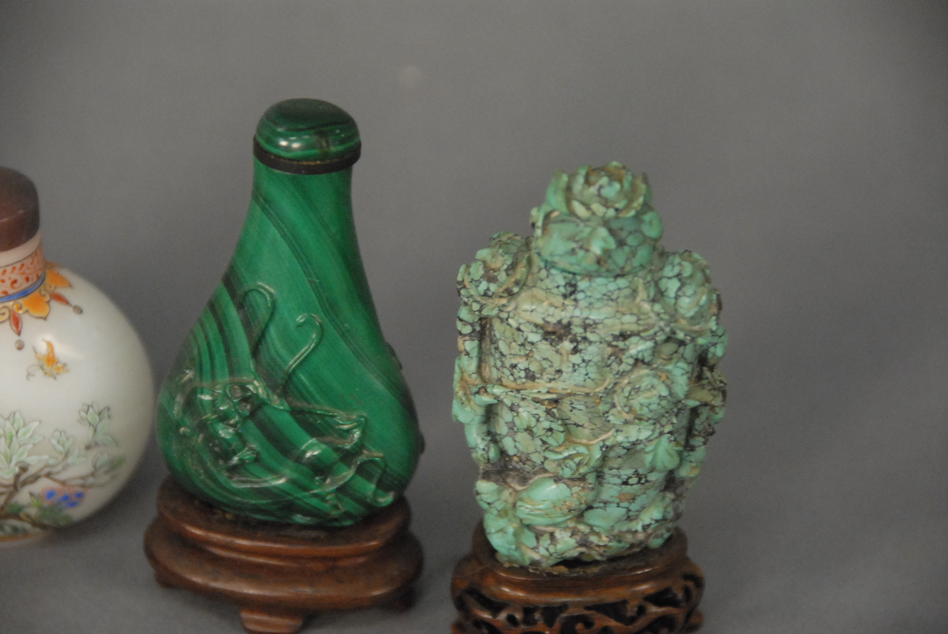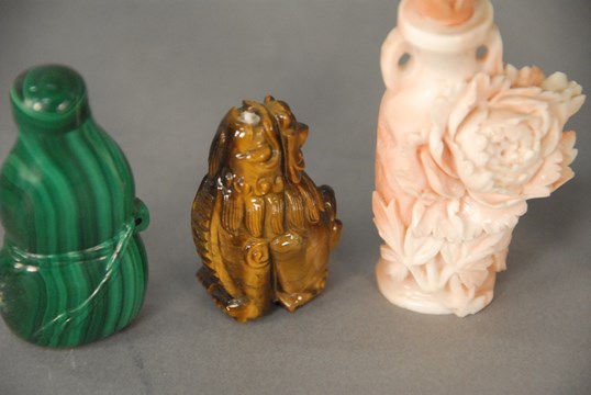 Lot 183: Group of six hard stone snuff bottles to include two malachite, one tiger eye foo dog, a white bottle with enameled painting of blossoming tree with birds, and carved turquois bottle with stopper.