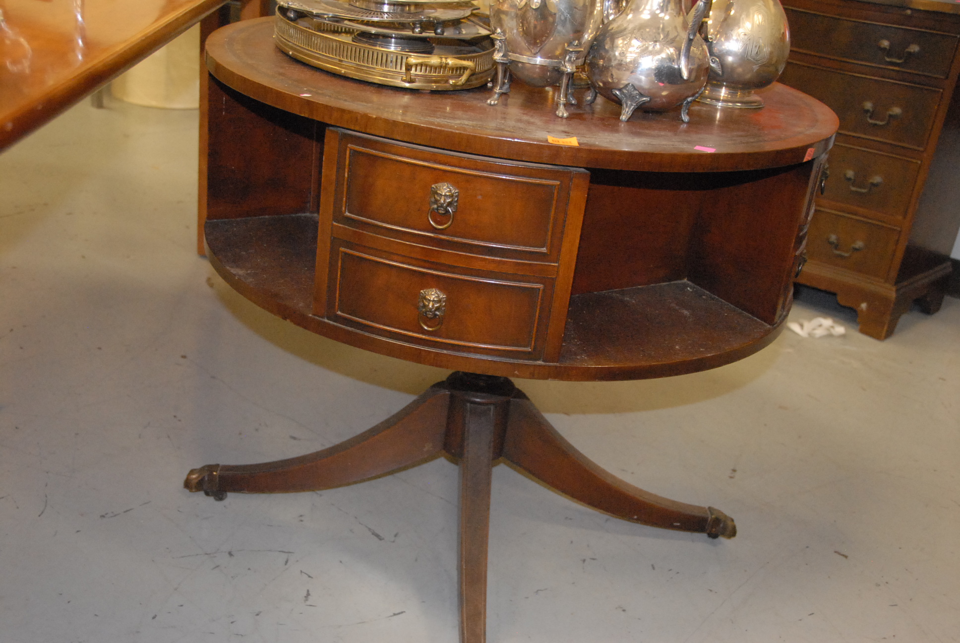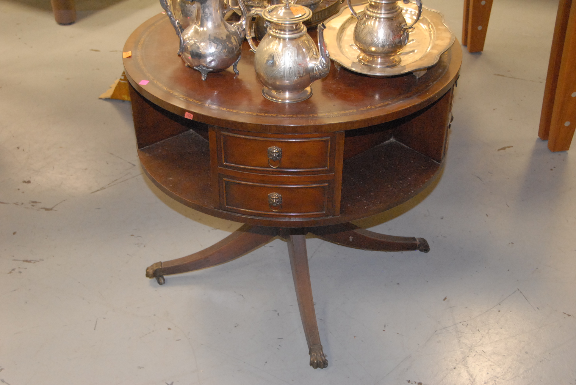 Mahogany drum table with leather top.