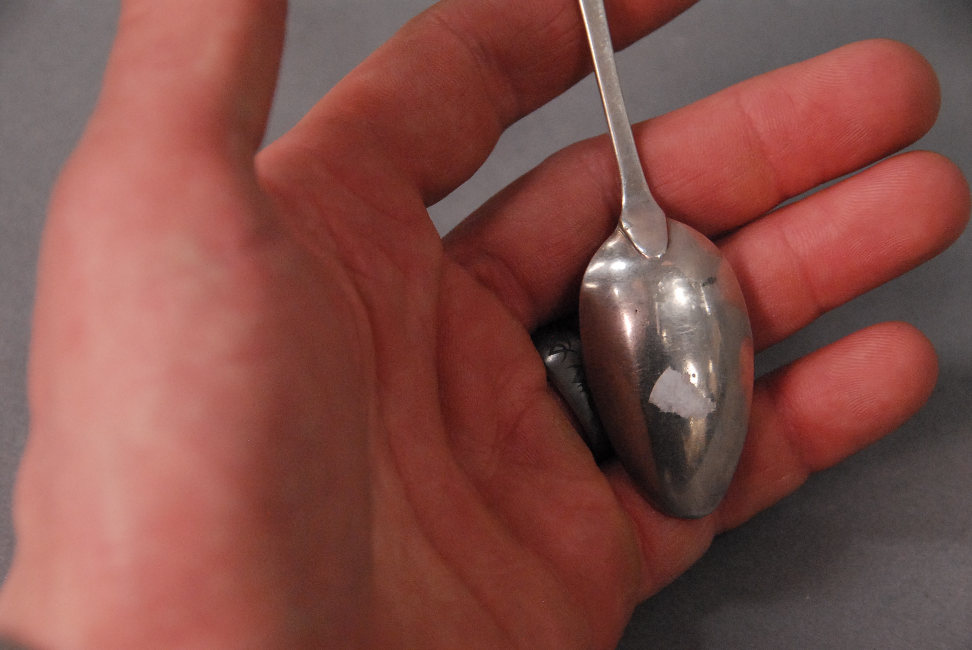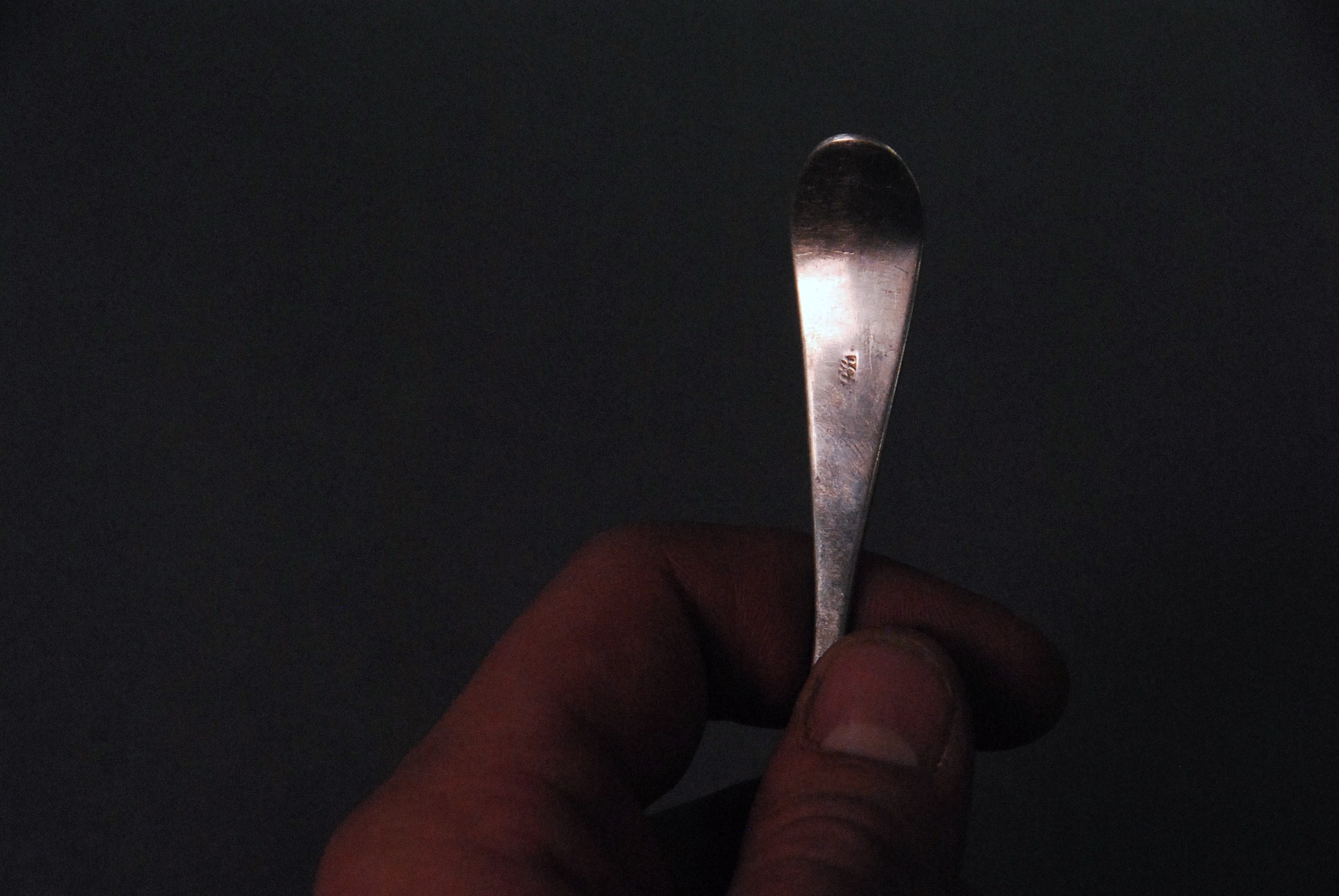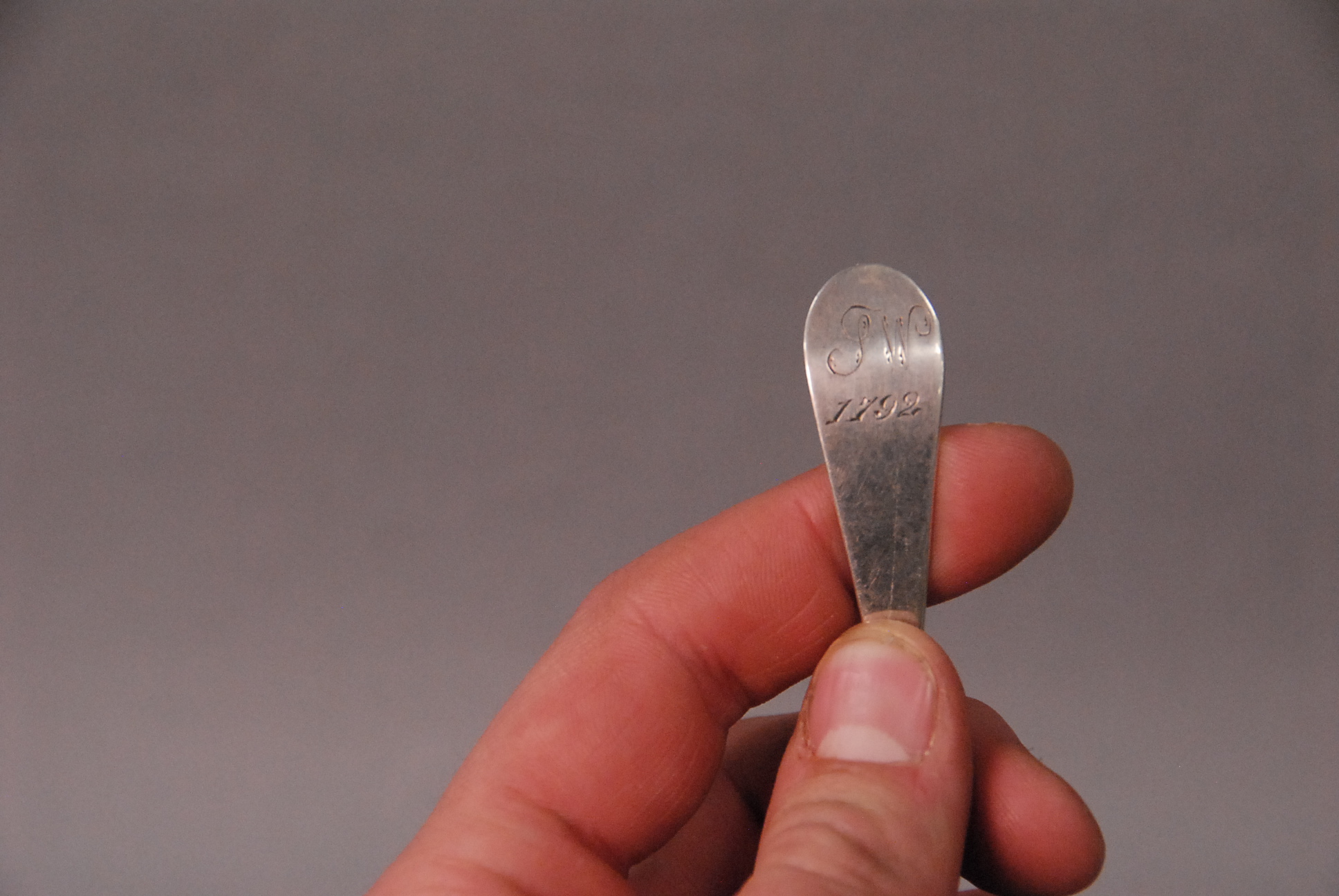 Paul Revere silver teaspoon, hallmarked P. R., monogrammed and marked 1792.