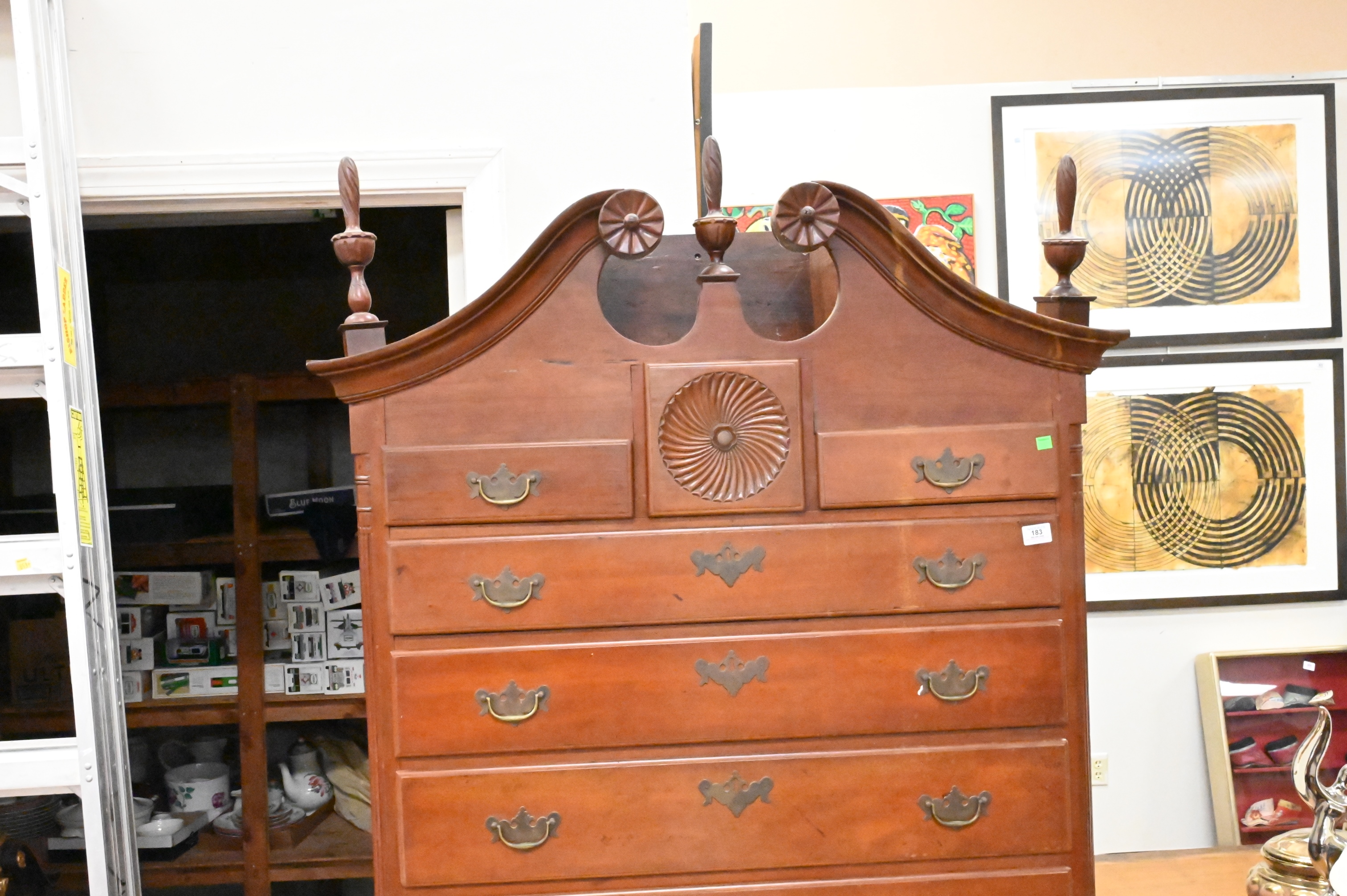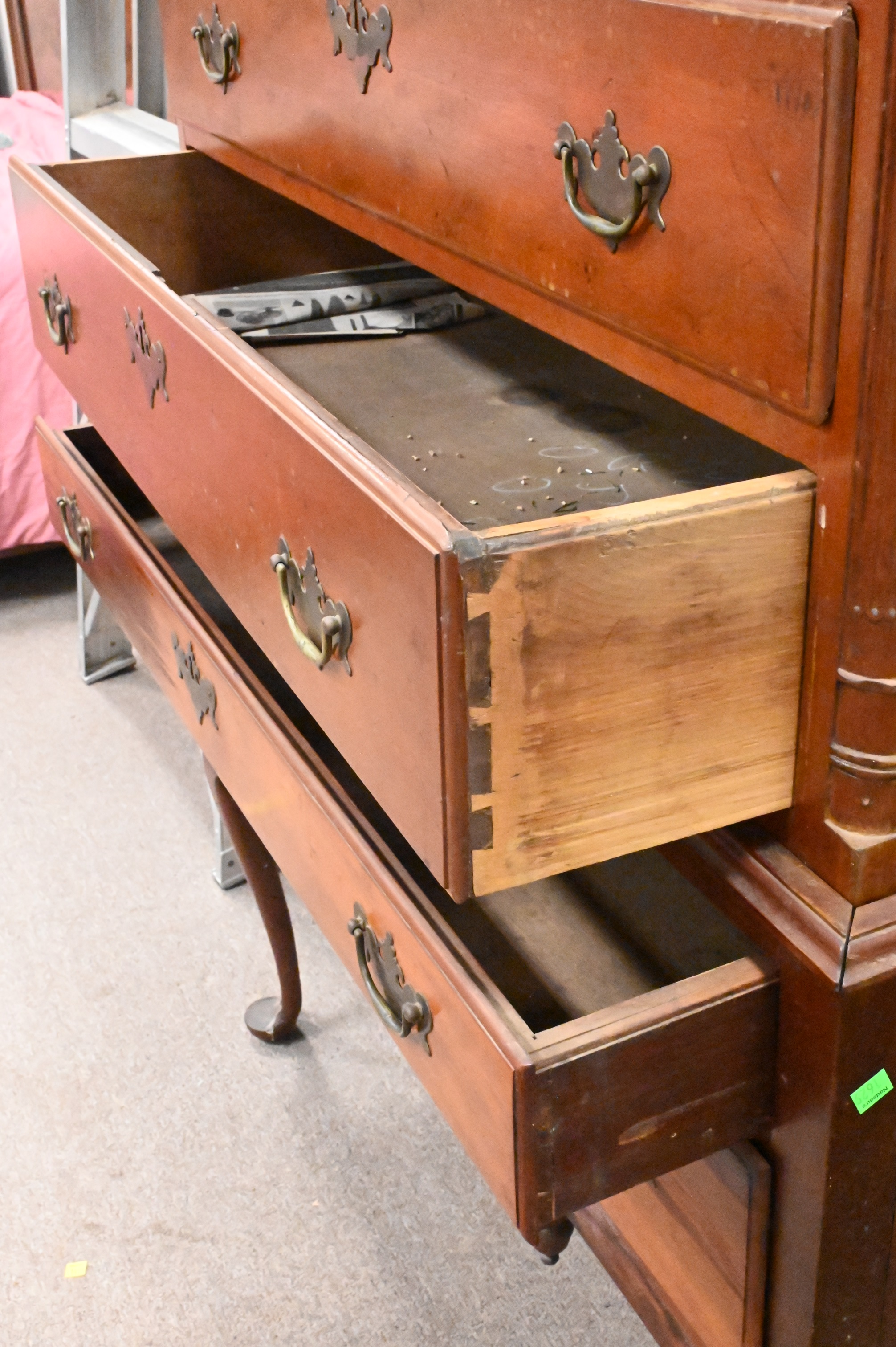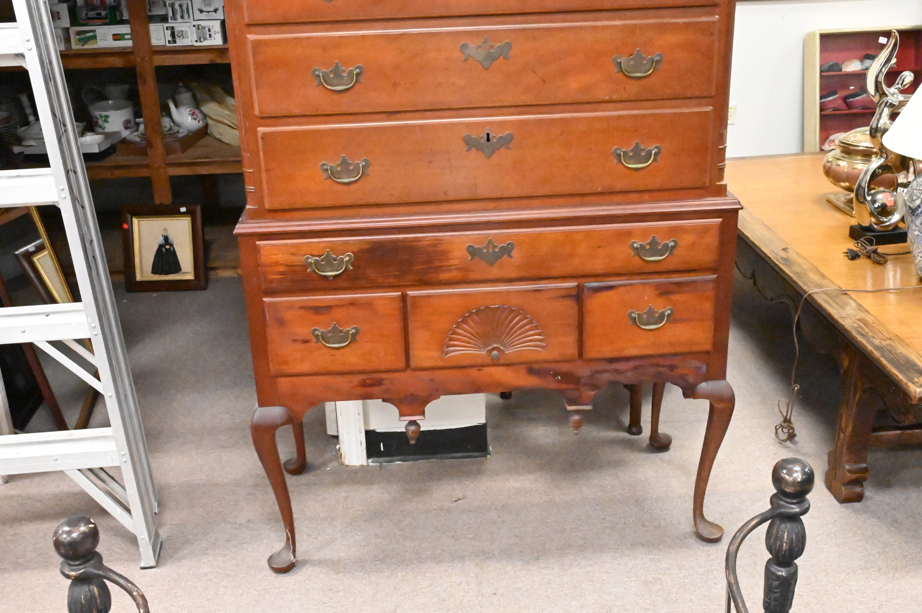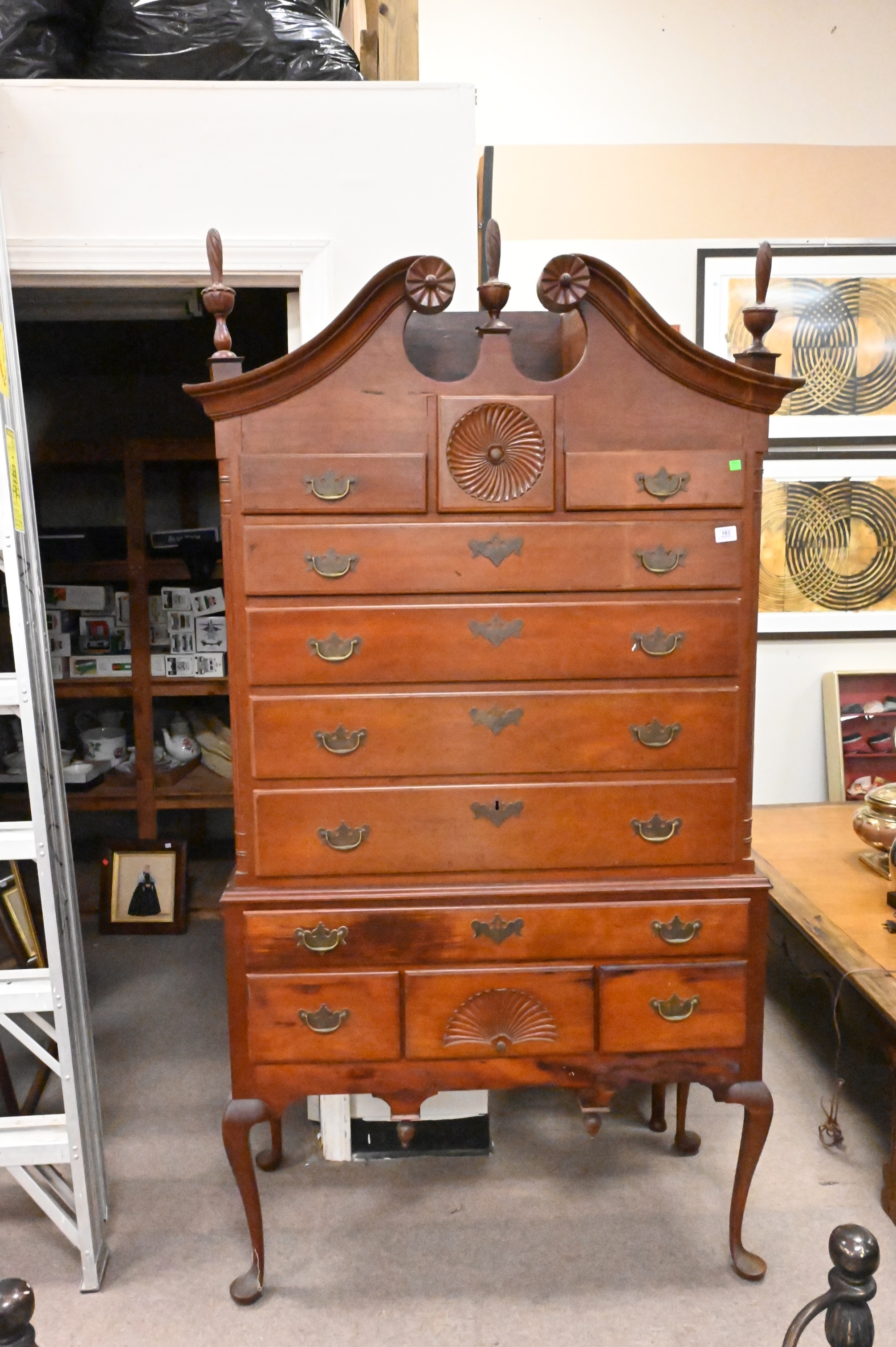 Queen Anne Cherry Highboy, with full bonnet top, with pinwheels on base, with fan carvings, all set on cabriole legs ending in pad feet, 18th century, marries, height 80 inches, length 41 inches, Provenance: Estate of Donald K. Huber