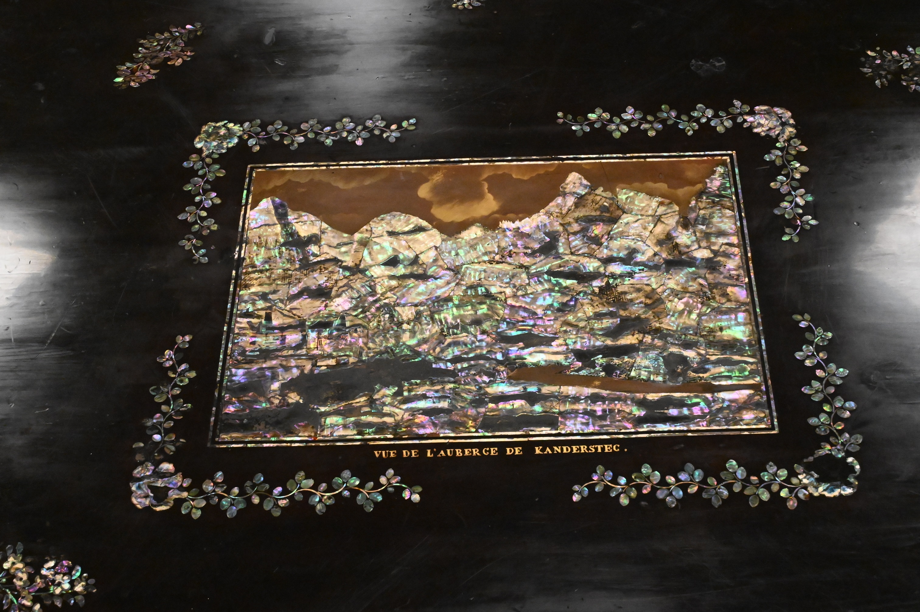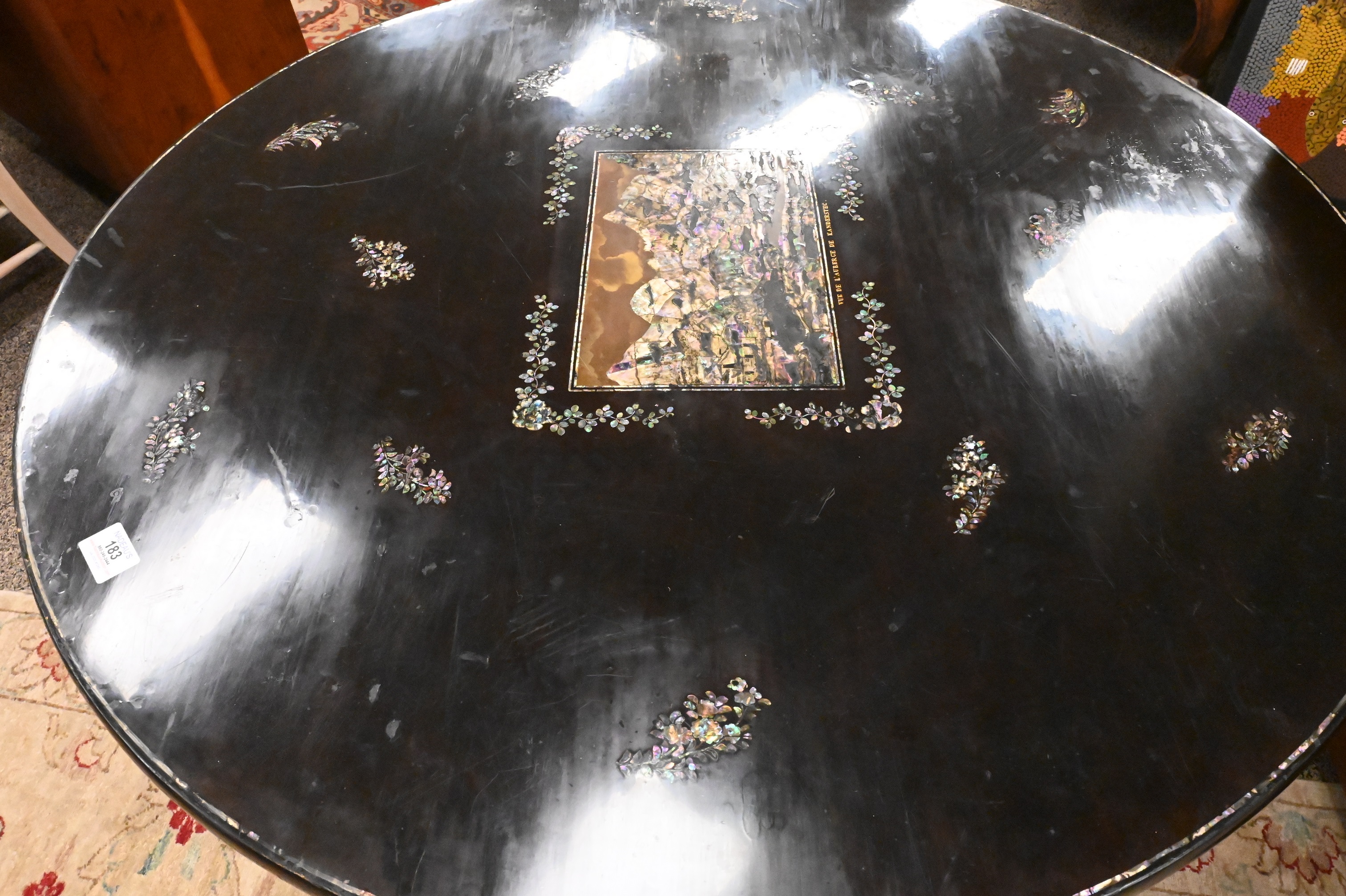 Victorian Lacquered Center Top Table, having Mother of Pearl inlaid top and base set on claw feet, inlay in top marked ” Vue De L’auberge De Kandersteg”, height 29 inches, diameter 39 inches.