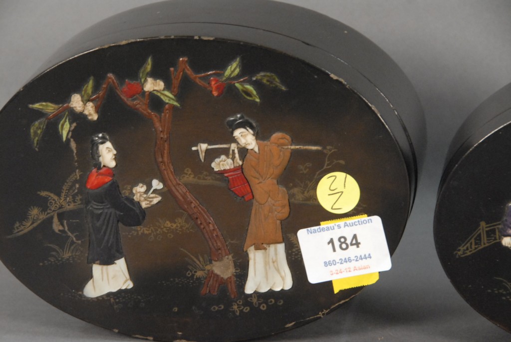 Lot 184: A set of three oval covered boxes, having mother of pearl, hard wood and hardstone inlay, each depicting scene of two boys playing a…