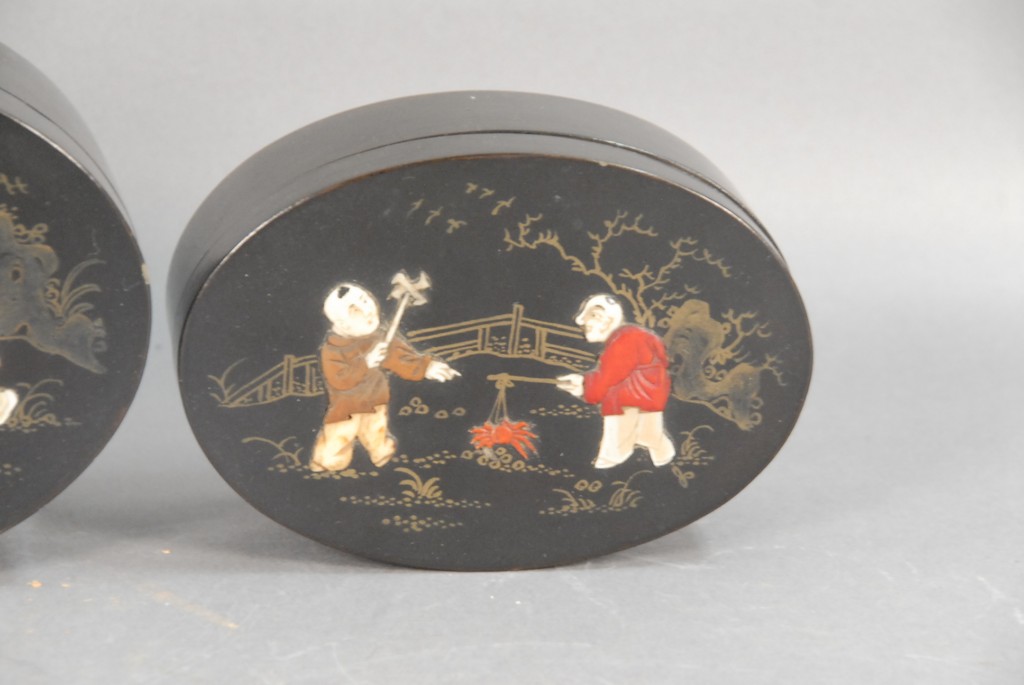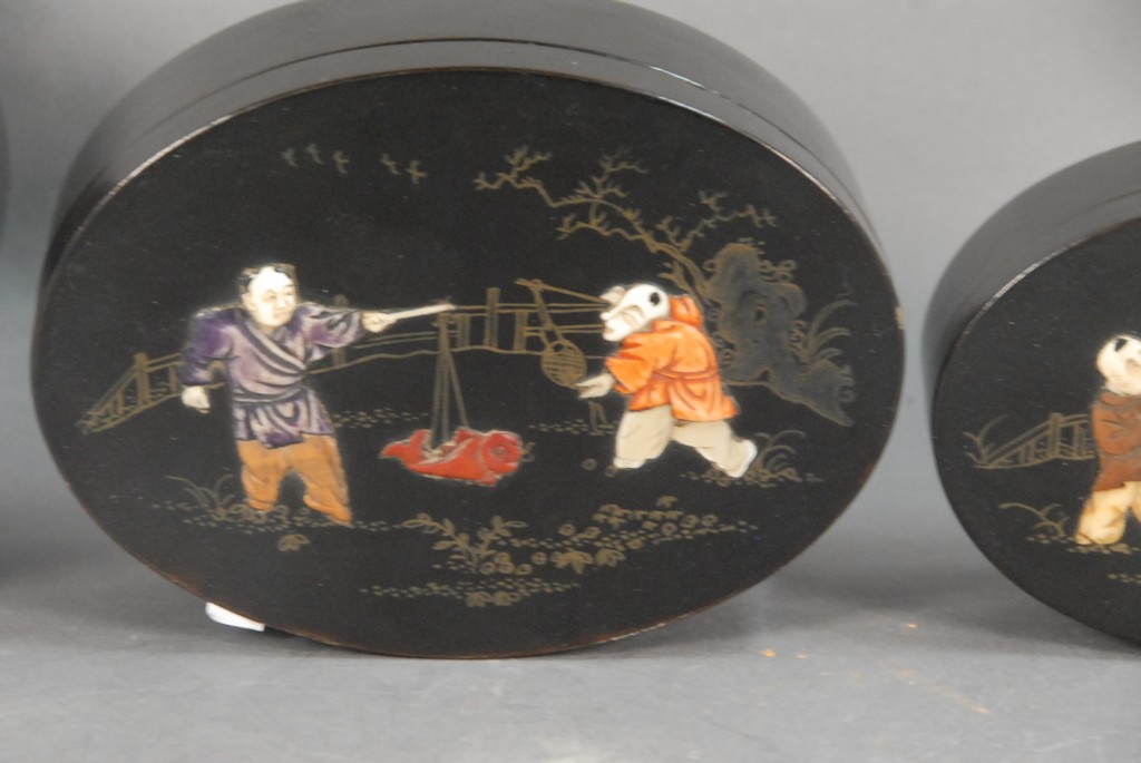 A set of three oval covered boxes, having mother of pearl, hard wood and hardstone inlay, each depicting scene of two boys playing and getting older as the box gets bigger, largest box lg 7 3/4 wd 5 1/2 ht 3 1/2