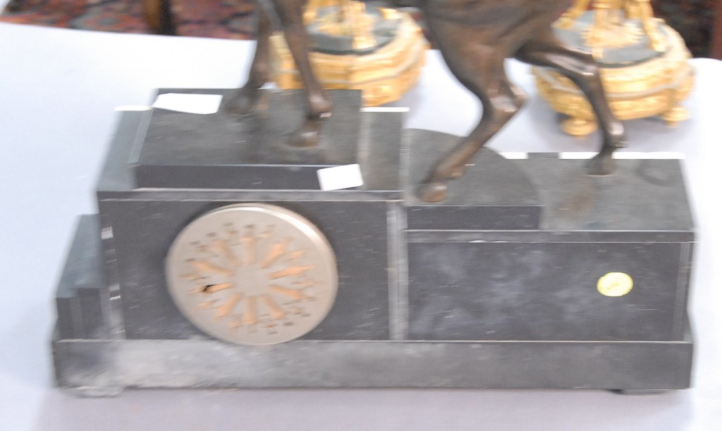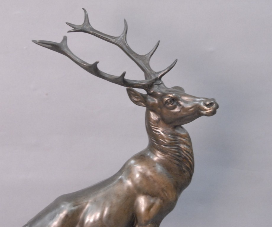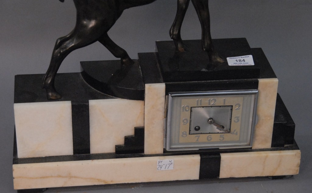 Art Deco mantle clock mounted with bronze stag. height 24in. width 17in.