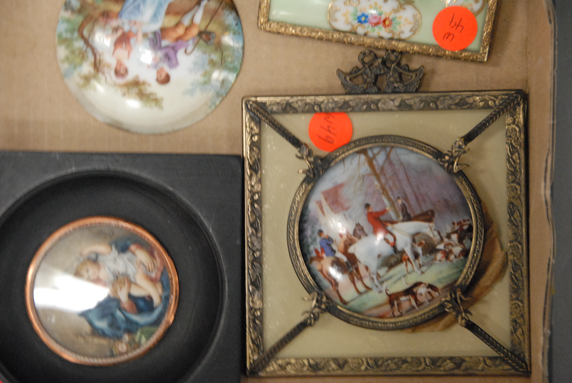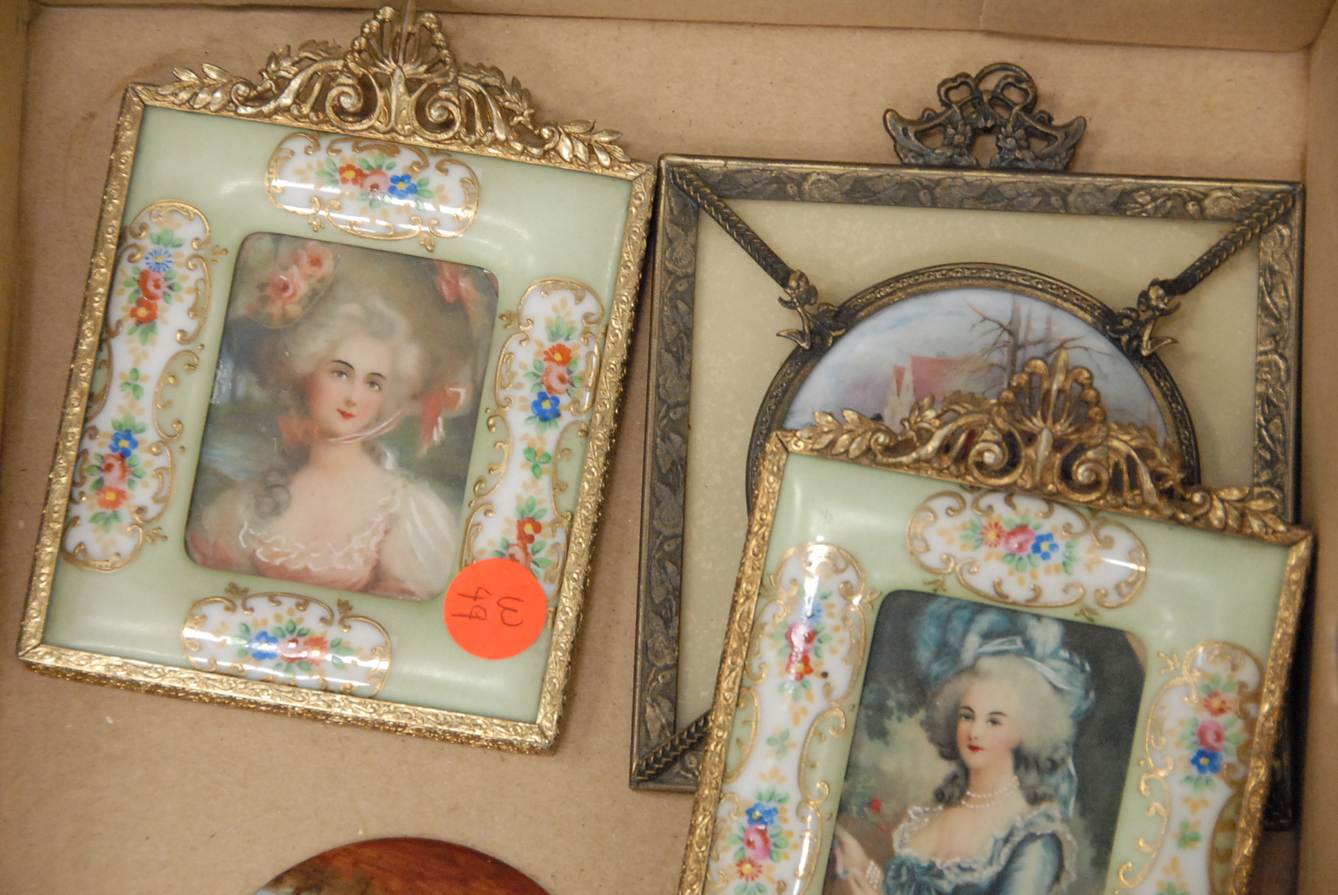 Box lot of porcelain frames and paintings, and a miniature painting on ivory.