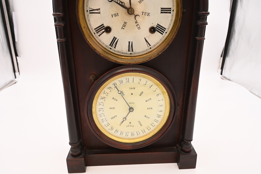 Lot 184: Burwell and Carter Double Dial Calendar Shelf Clock height 18 inches Provenance: Fifty Year Personal Collection of Clocks and American Antiques from Thomas Bailey, Manchester, Connecticut.