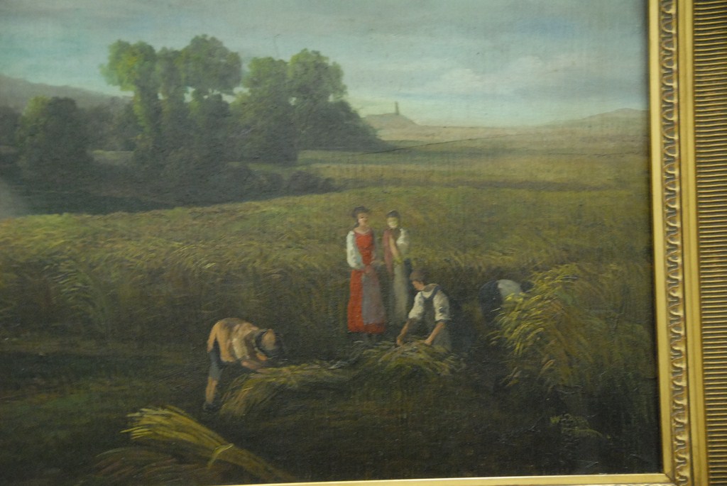 Contemporary decorative painting with peasants in field, 24 x 36.