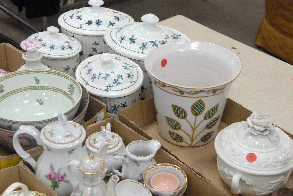 Eight box lots china, porcelain, bowls, dishes, cups, saucers, tea set, four covered decanters.