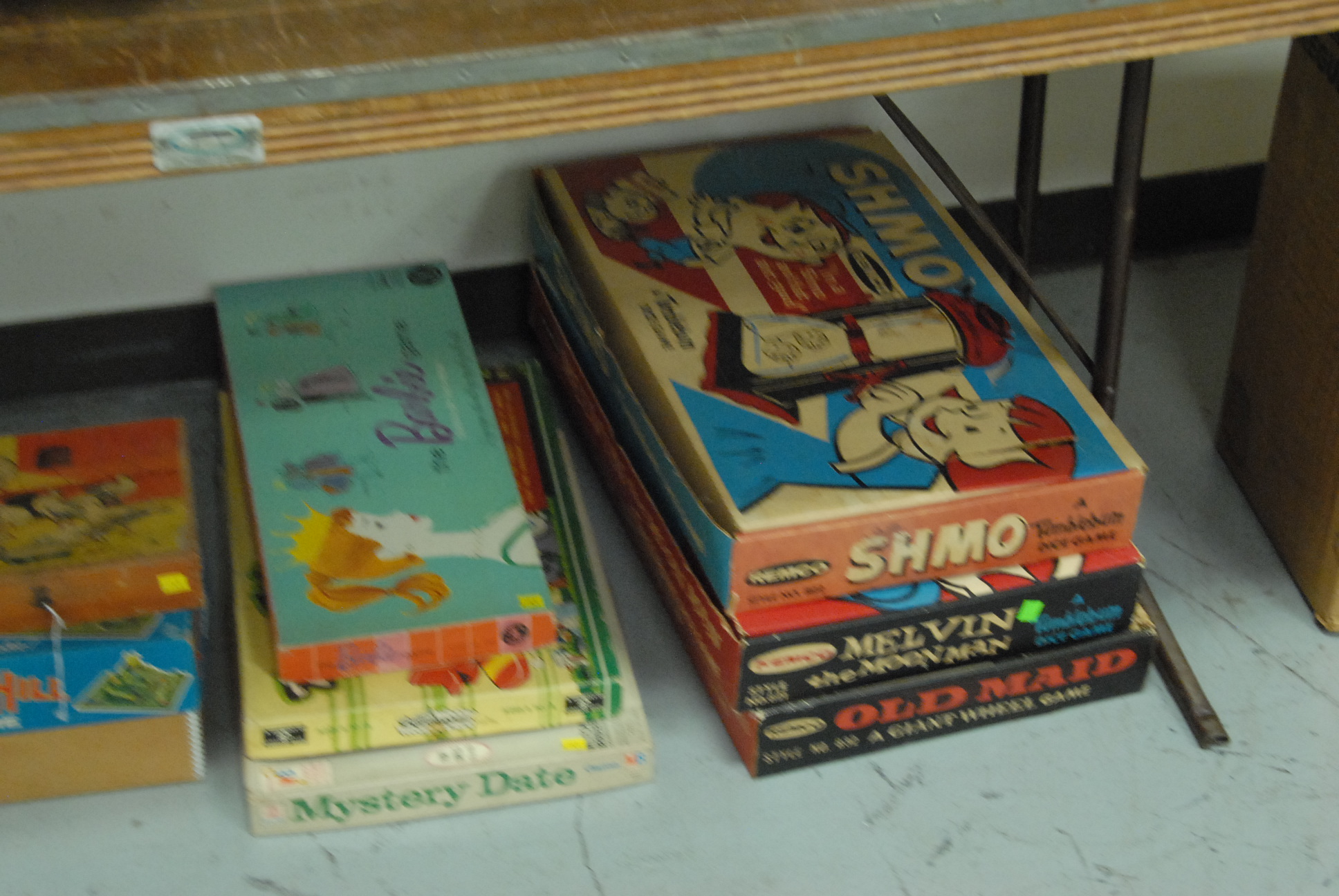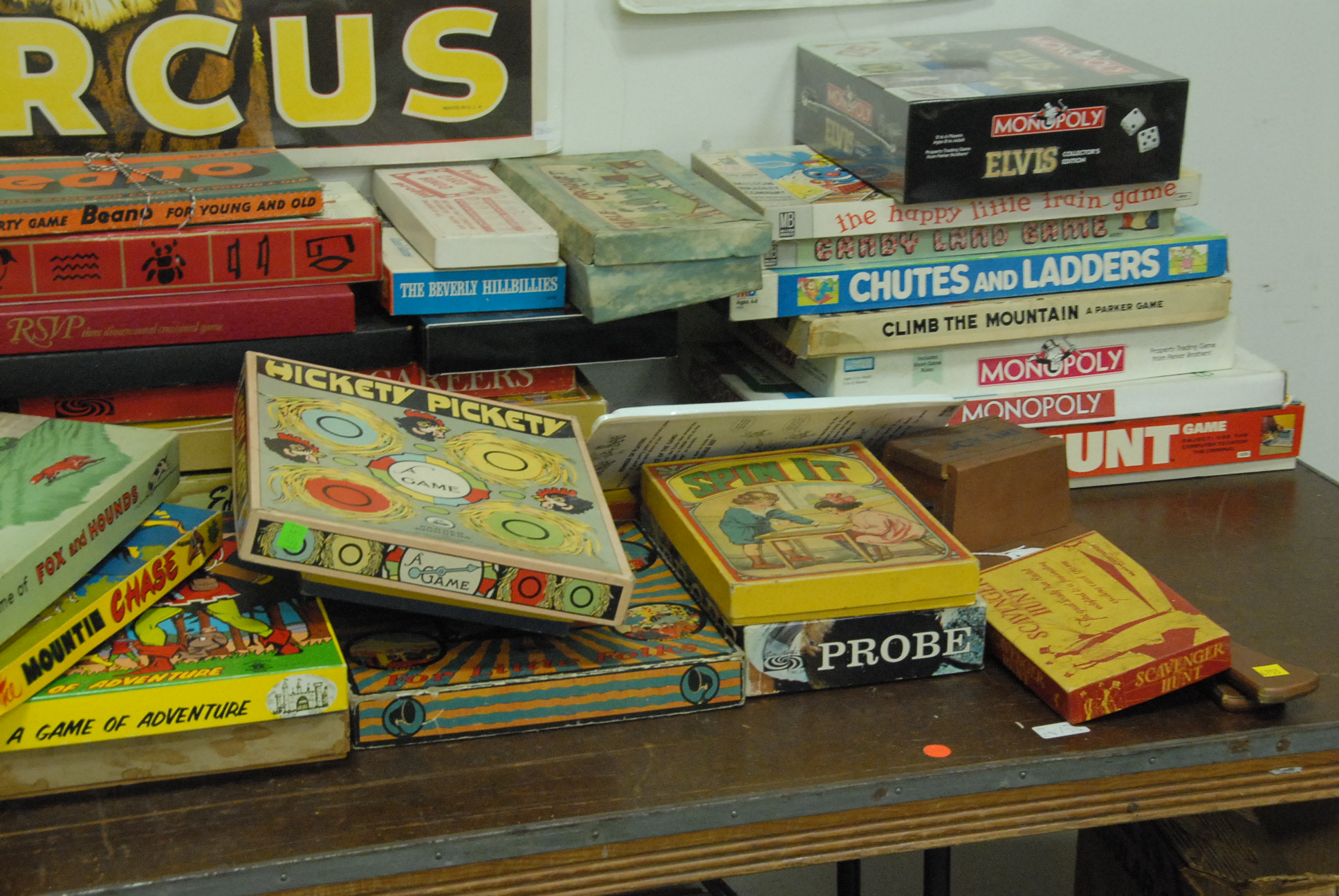 Fifty-seven various games in boxes Old Maid, Monopoly Elvis Edition, Chutes and Ladders, vintage Table Crochet, Barney Google and Spark Plug, Aviation, Calling All Cars, Scavenger Hunt, Spin It, early to late 20th century.