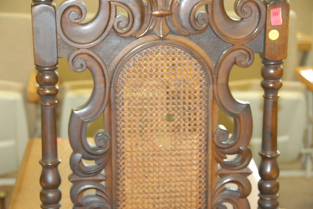 Flemish style armchair with cane seat and back cane in back has two holes.