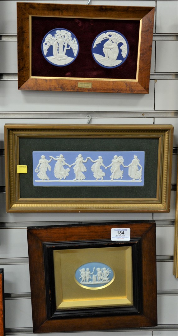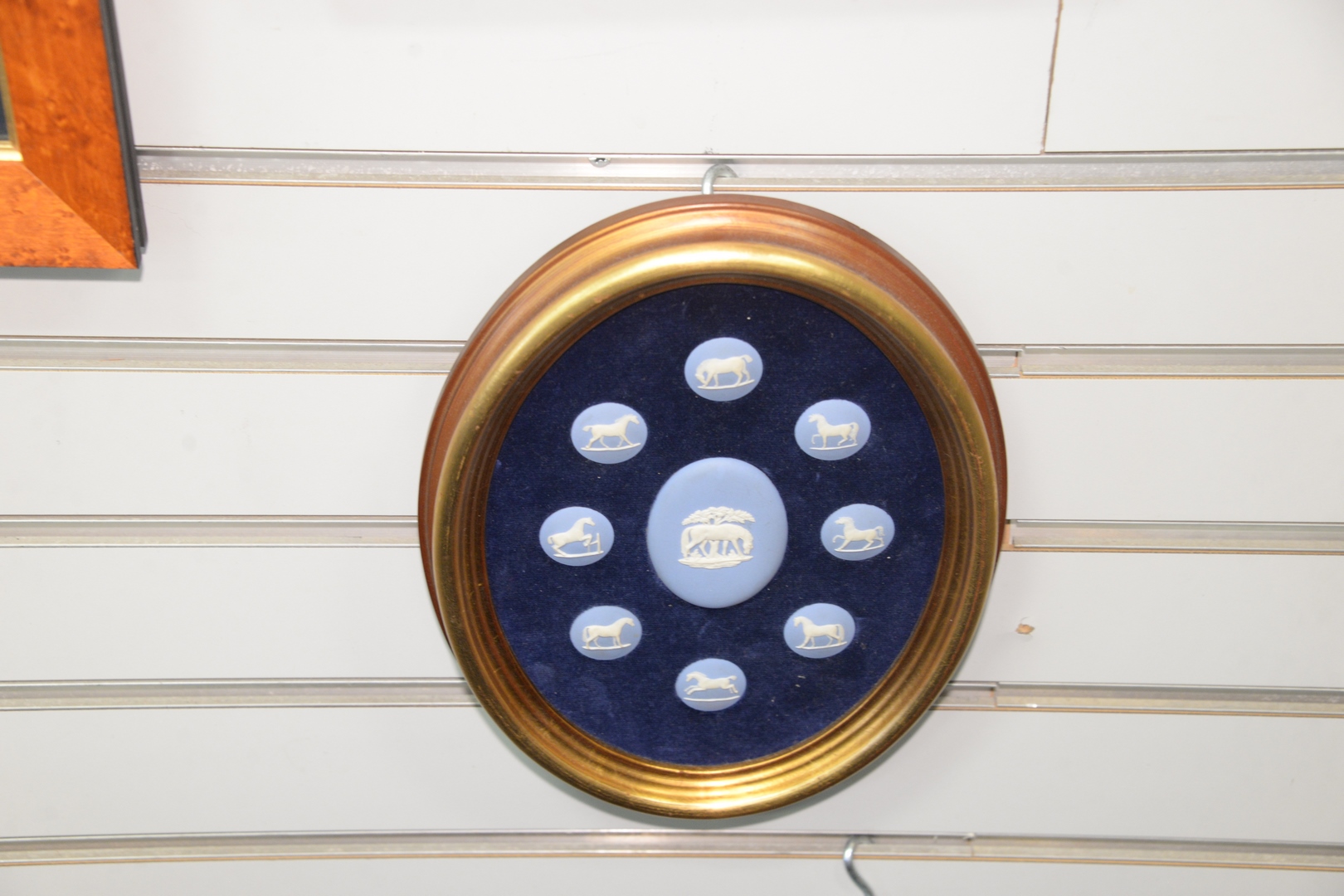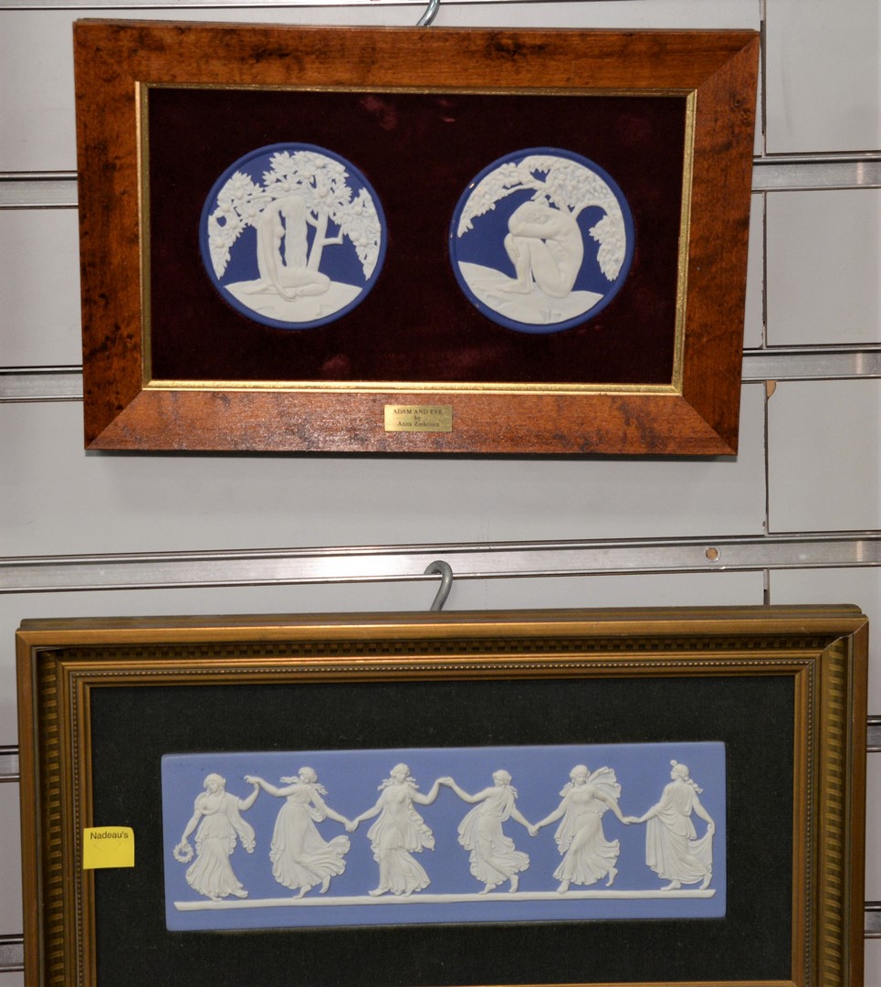 Lot 184: Group of Five Framed Wedgwood Jasperware Plaques or Medallions, to include framed Adam and Even medallion plaques; rectangle “Dancing Hours”, small oval medallion with cherubs, nine horse medallions, along with a framed oval plaque, largest frame 15 1/2″ x 13″. Provenance: Estate of James Wadhams.