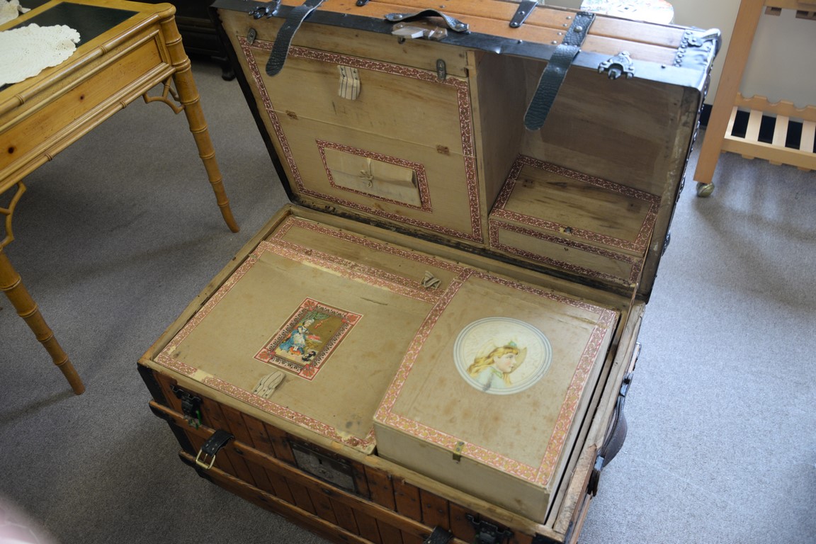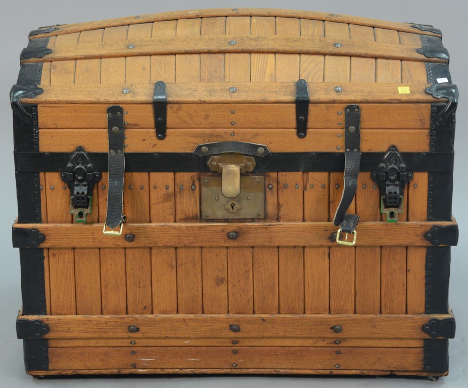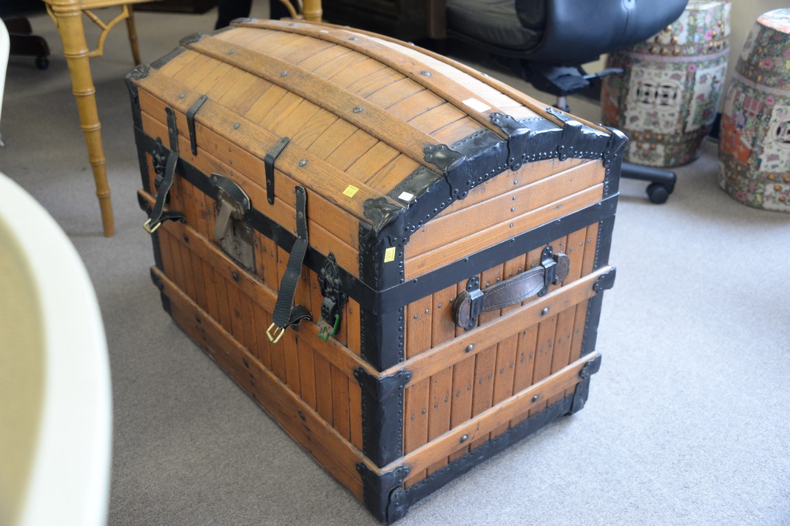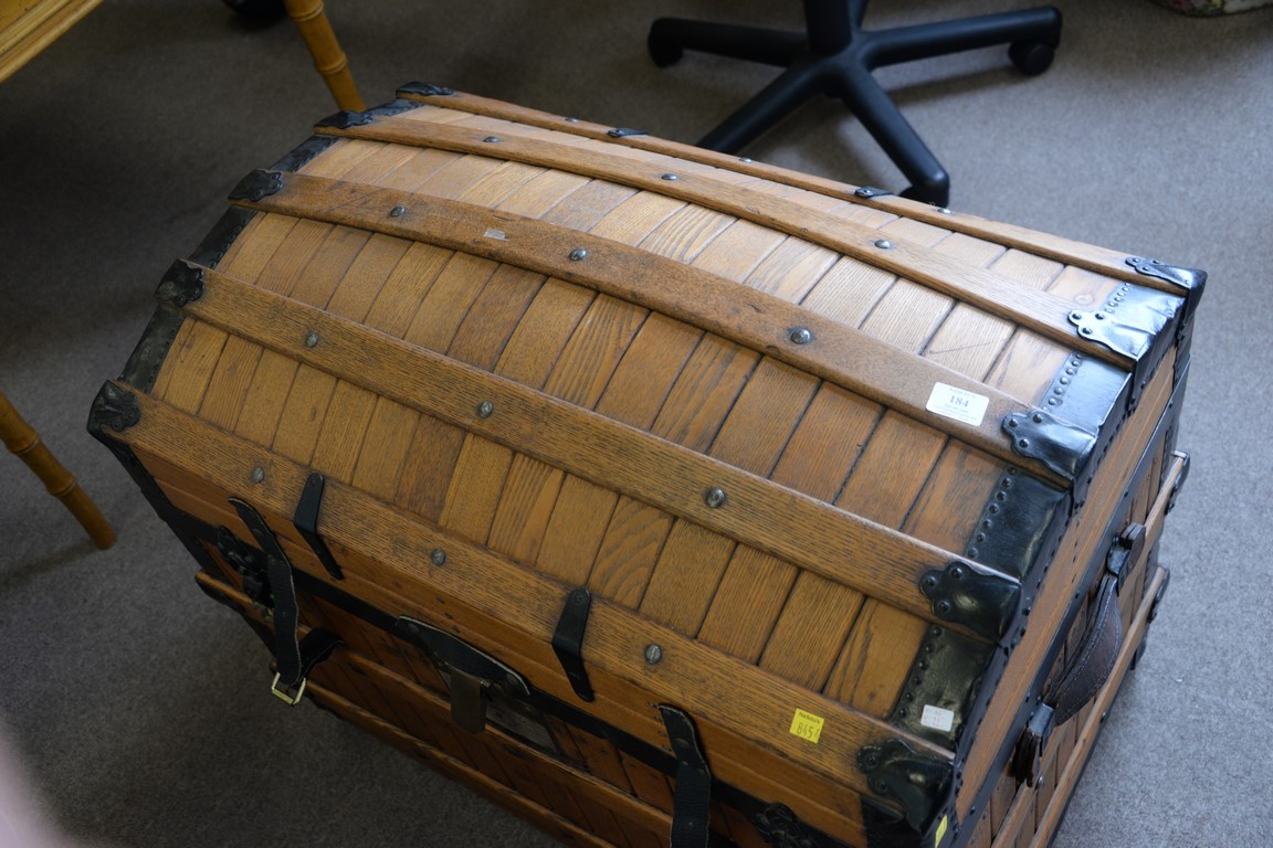 Lot 184: Oak trunk made with bentwood oak strapping having tray interior. ht. 26in., wd. 32in., dp. 20in.