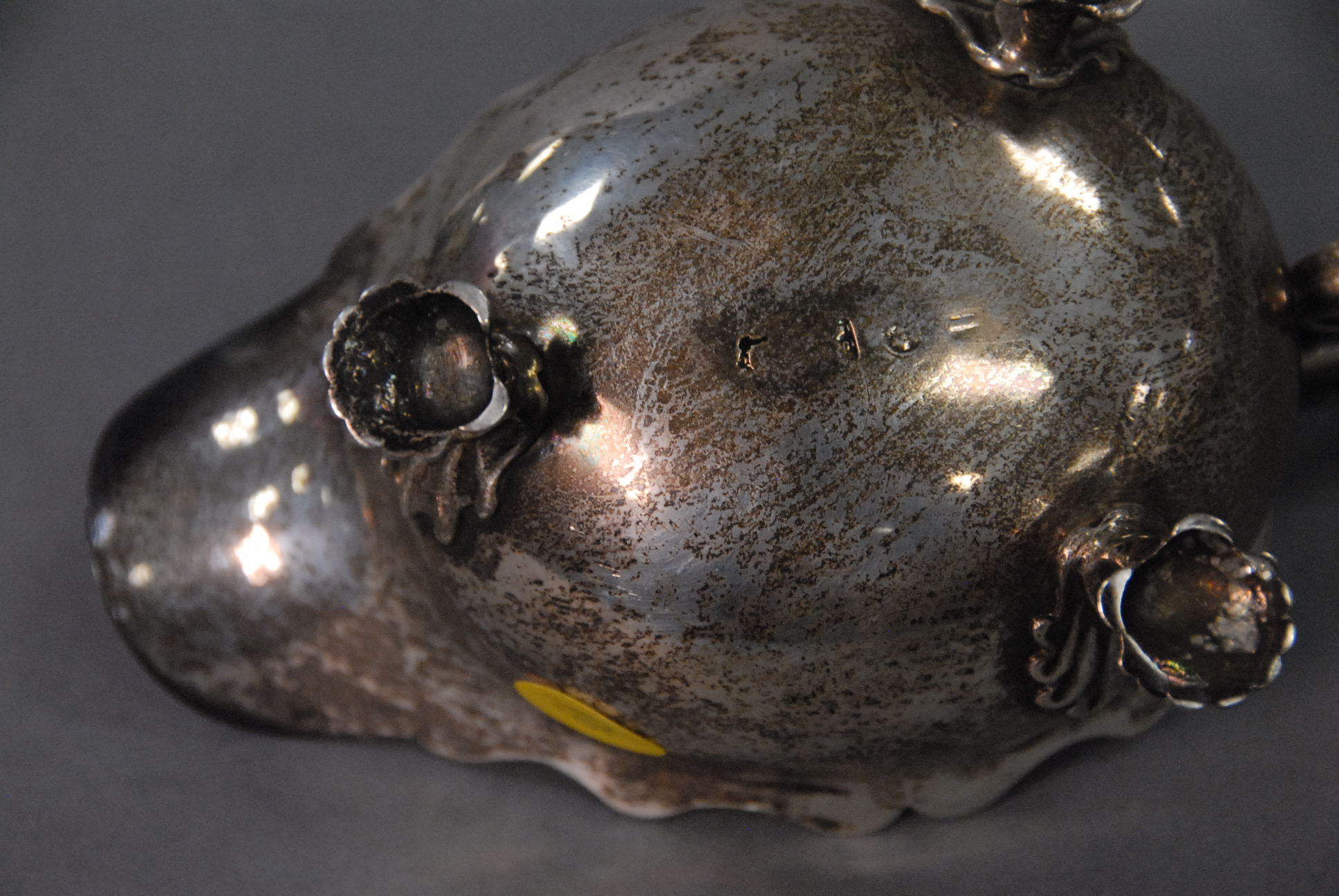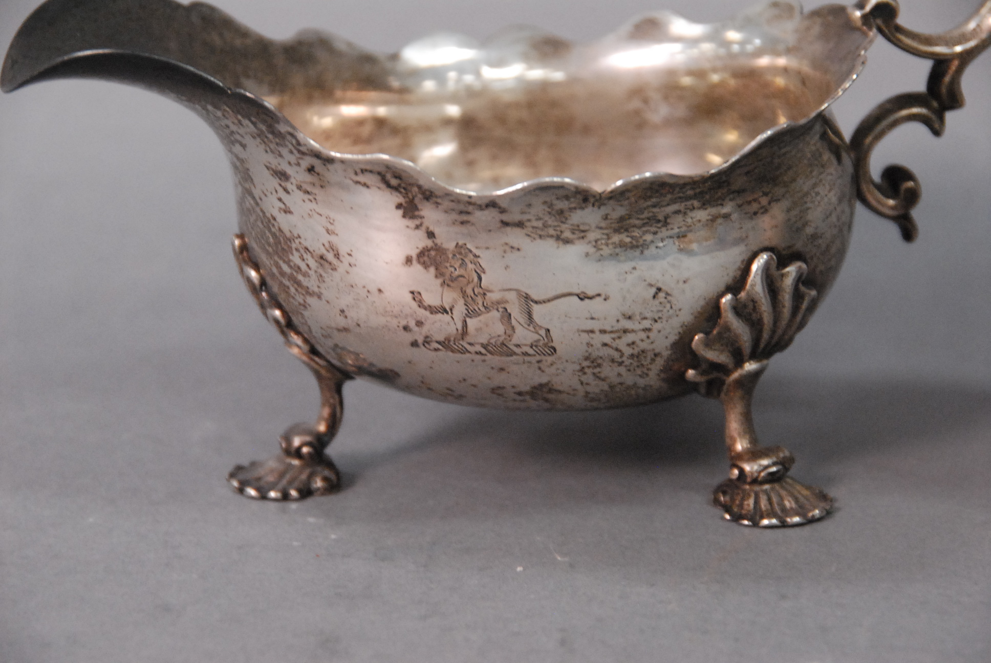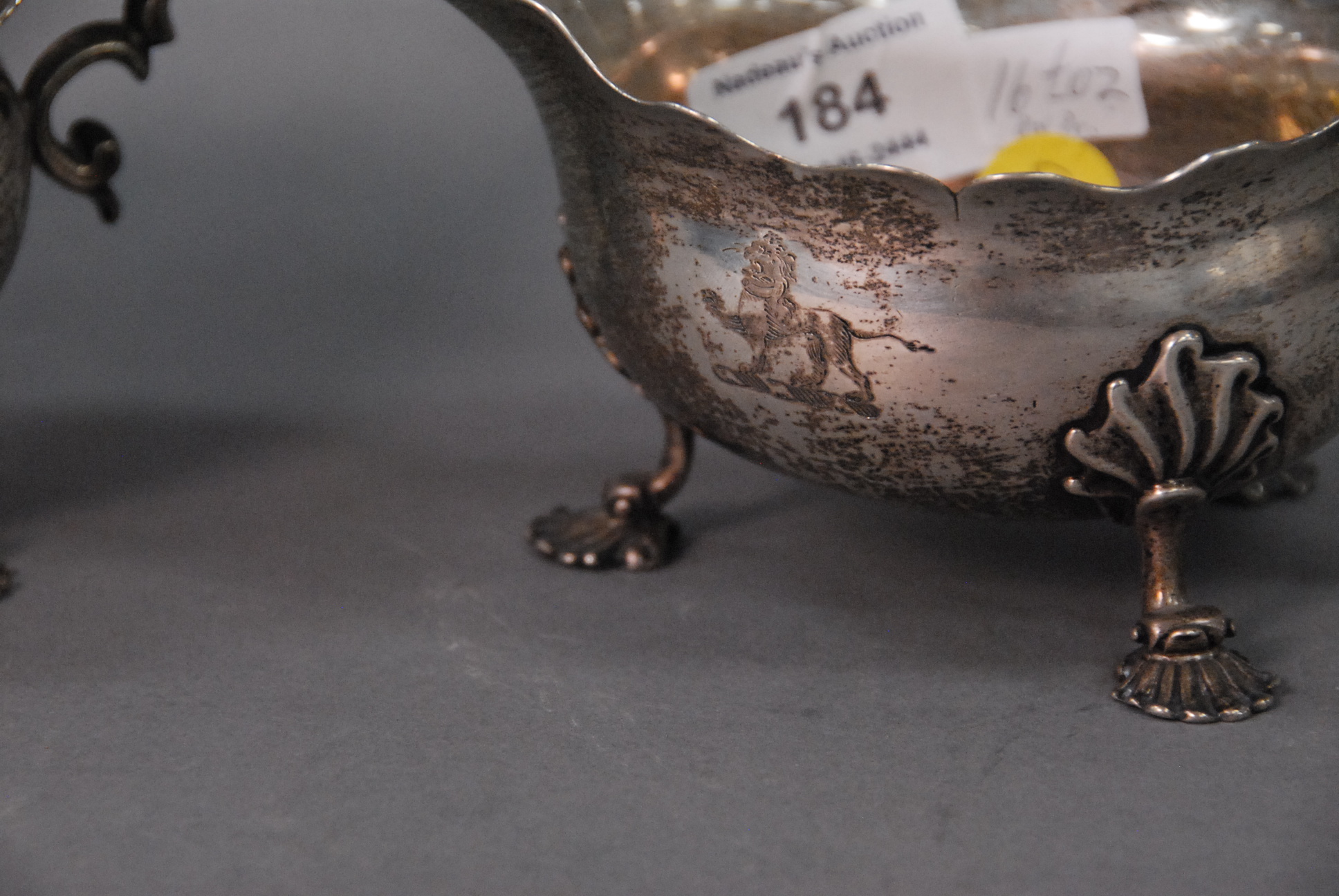 Pair of Georgian silver gravy boats with scroll handles, set on scallop shell feet, 16 troy oz.