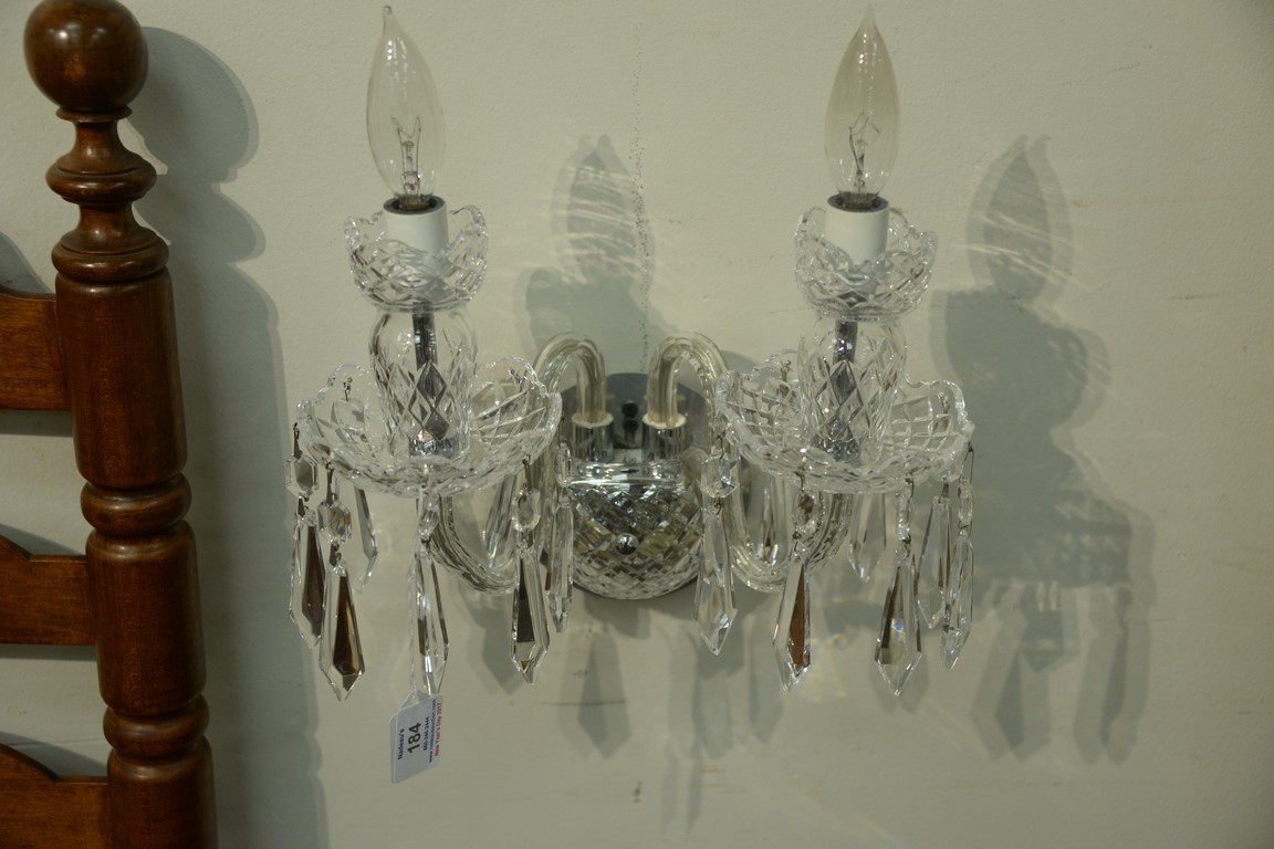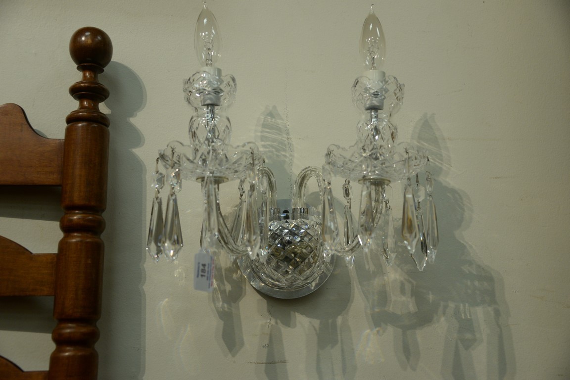 Pair of Waterford crystal Avoca double arm wall sconces with prisms. ht. 9in., wd. 13in.