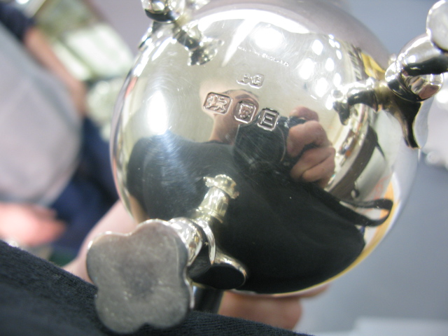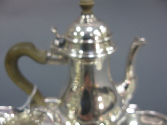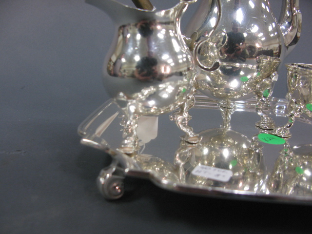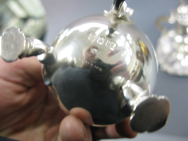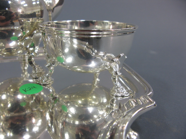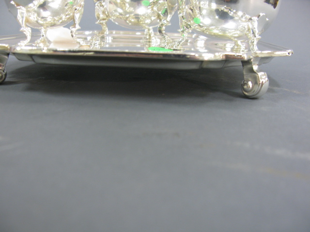 Peter Guile four piece sterling silver tea set with tea pot, sugar, creamer and tray with scrolled feet.