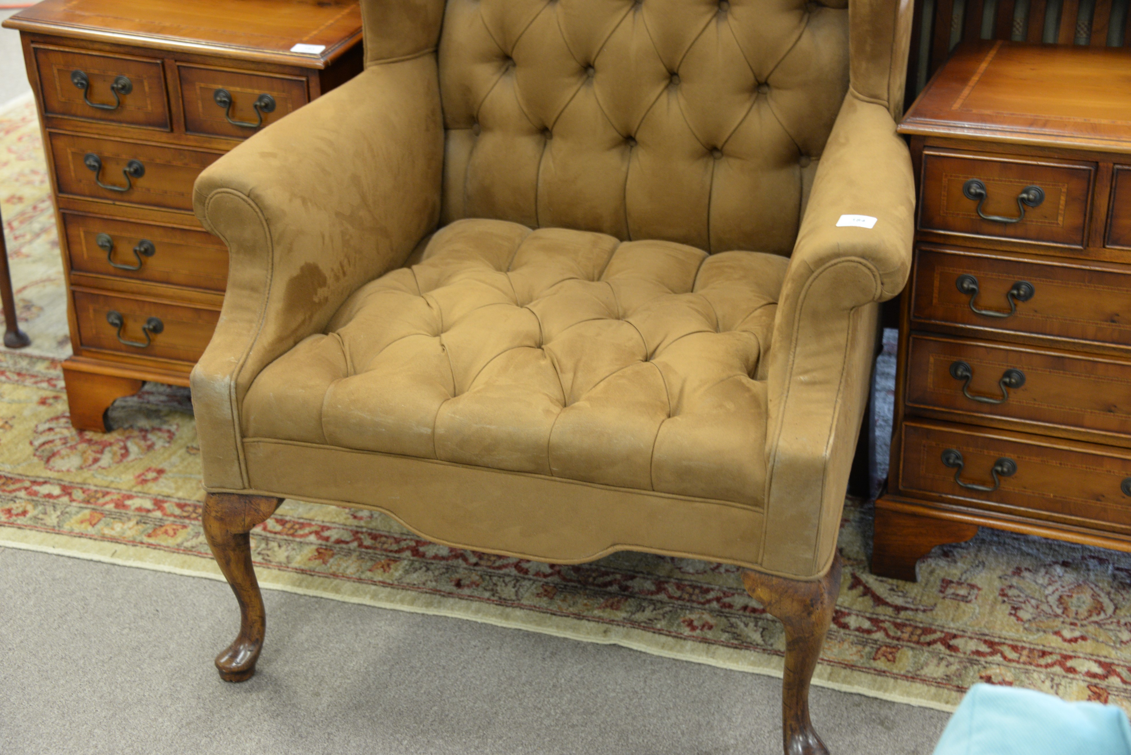 Queen Anne style upholstered wing chair with tufted back and seat.