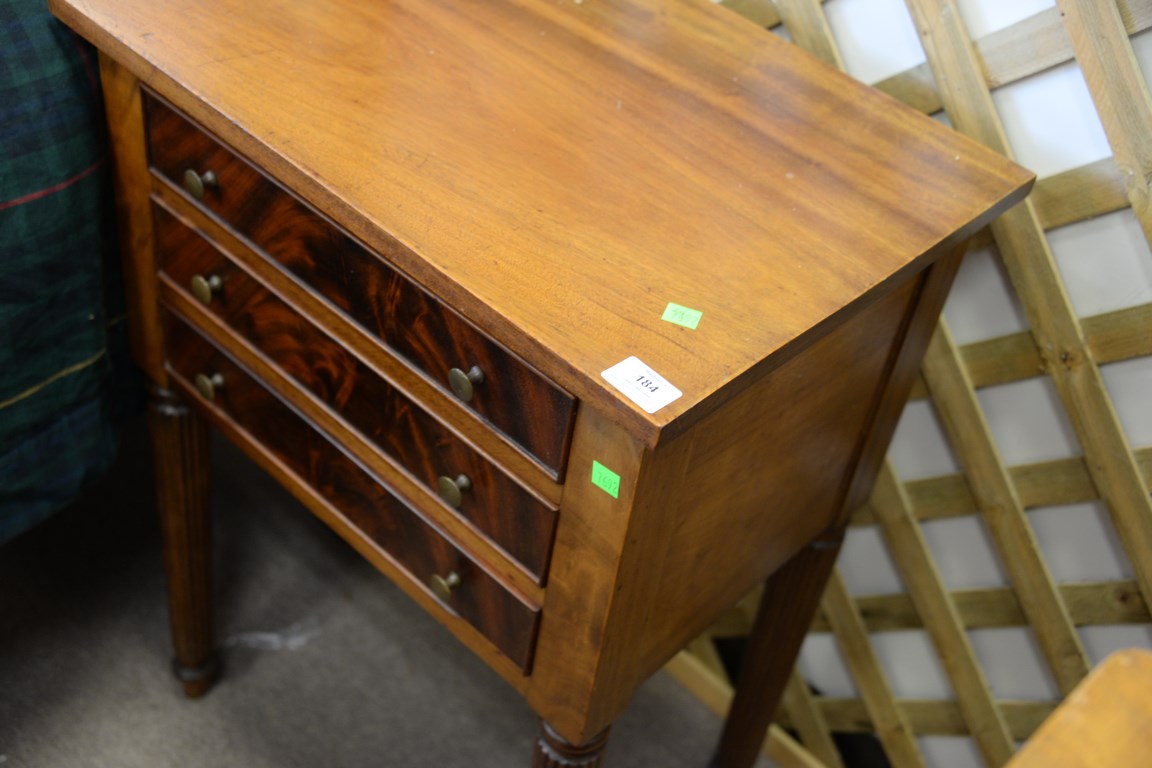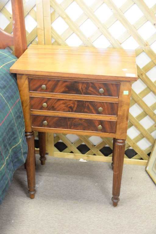 Lot 184: Sheraton mahogany three drawer stand on turned and reeded legs, circa 1830, cut down, ht 30 in. wd. 21 1/2 in.