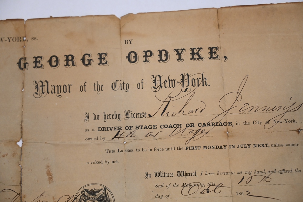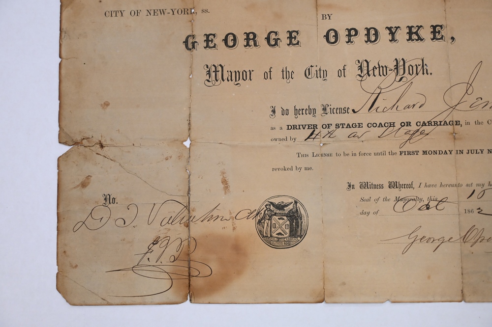Stagecoach License, 1863, issued by the City of New York, ink on paper (paper is torn and folded), 8 1/4″ x 13 1/2″.