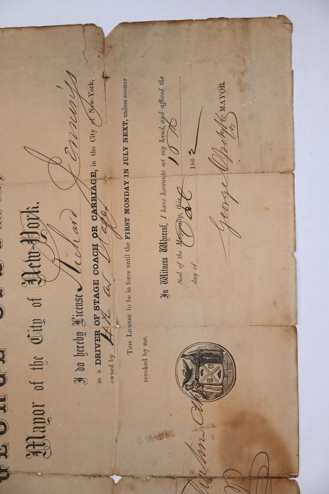 Lot 184: Stagecoach License, 1863, issued by the City of New York, ink on paper (paper is torn and folded), 8 1/4″ x 13 1/2″.