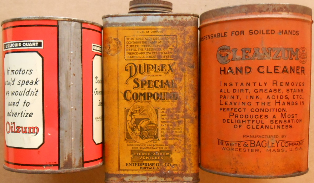 Three cans – Oilzum oil and hand cleaner missing cover, Duplex Pierce Arrow Special Compound