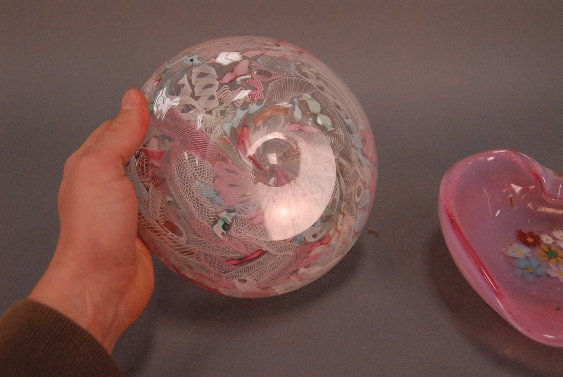 Two paperweight type dishes, round: dia. 7 1/2in., heart: 7 x 7 1/2.