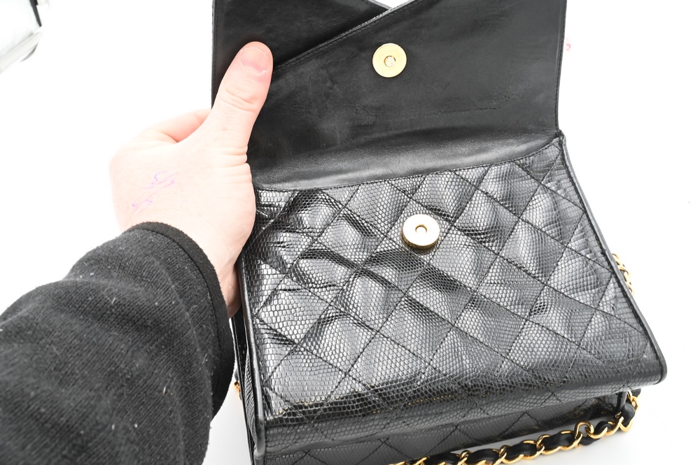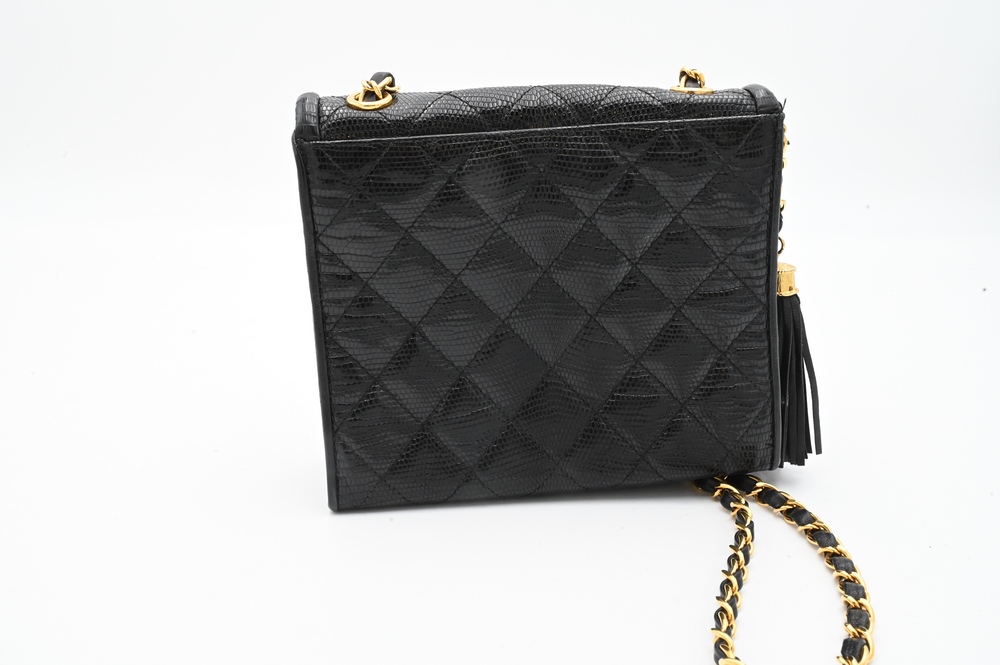 Lot 184: Vintage Chanel Leather Tassel Handbag/Purse, having quilted exterior and marked Chanel to interior, height 6 1/2 inches, width 7 1/2…