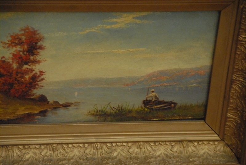 19th century oil on board painting of a boat along shore in a gold frame, unsigned, 6 x 12.