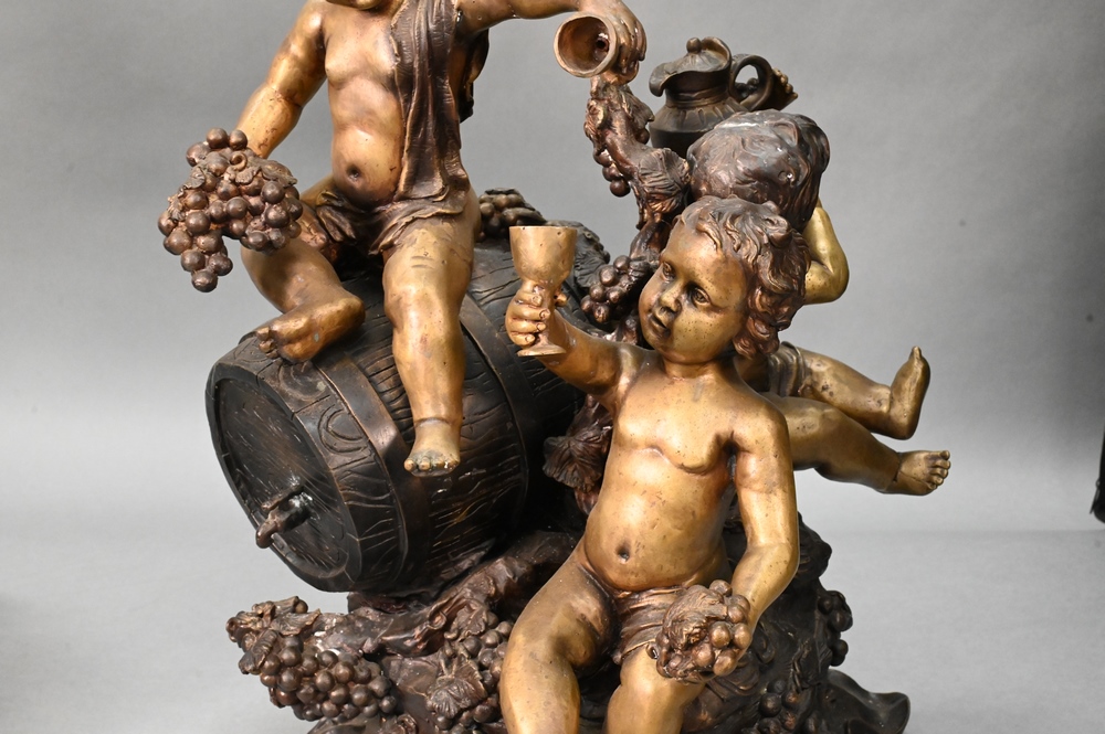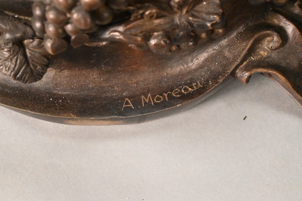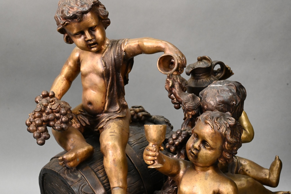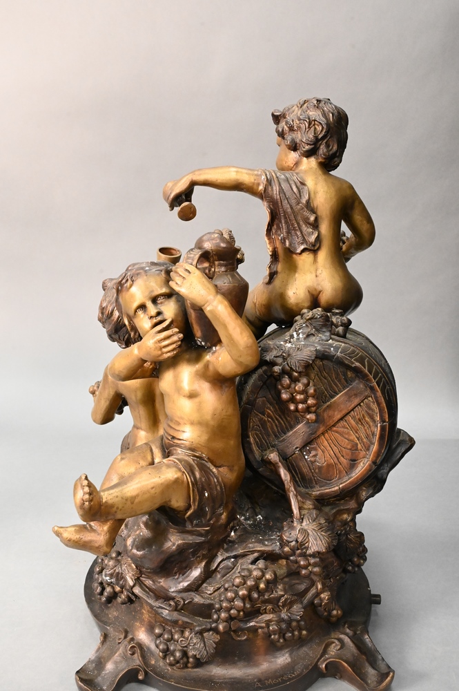 Lot 185: After Auguste Moreau Bronze Fountain, having three puttis sitting atop a wine barrel with grape vines and chalaces, signed “A. Moreau” on base, height 25 inches.