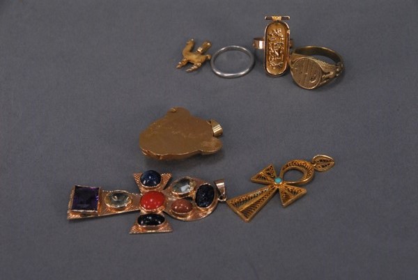 Lot 185: Bag lot to include 14K gold items including two crosses, ring, and a medallion, platinum ring, 18K gold ring, and 18K gold camel, 40