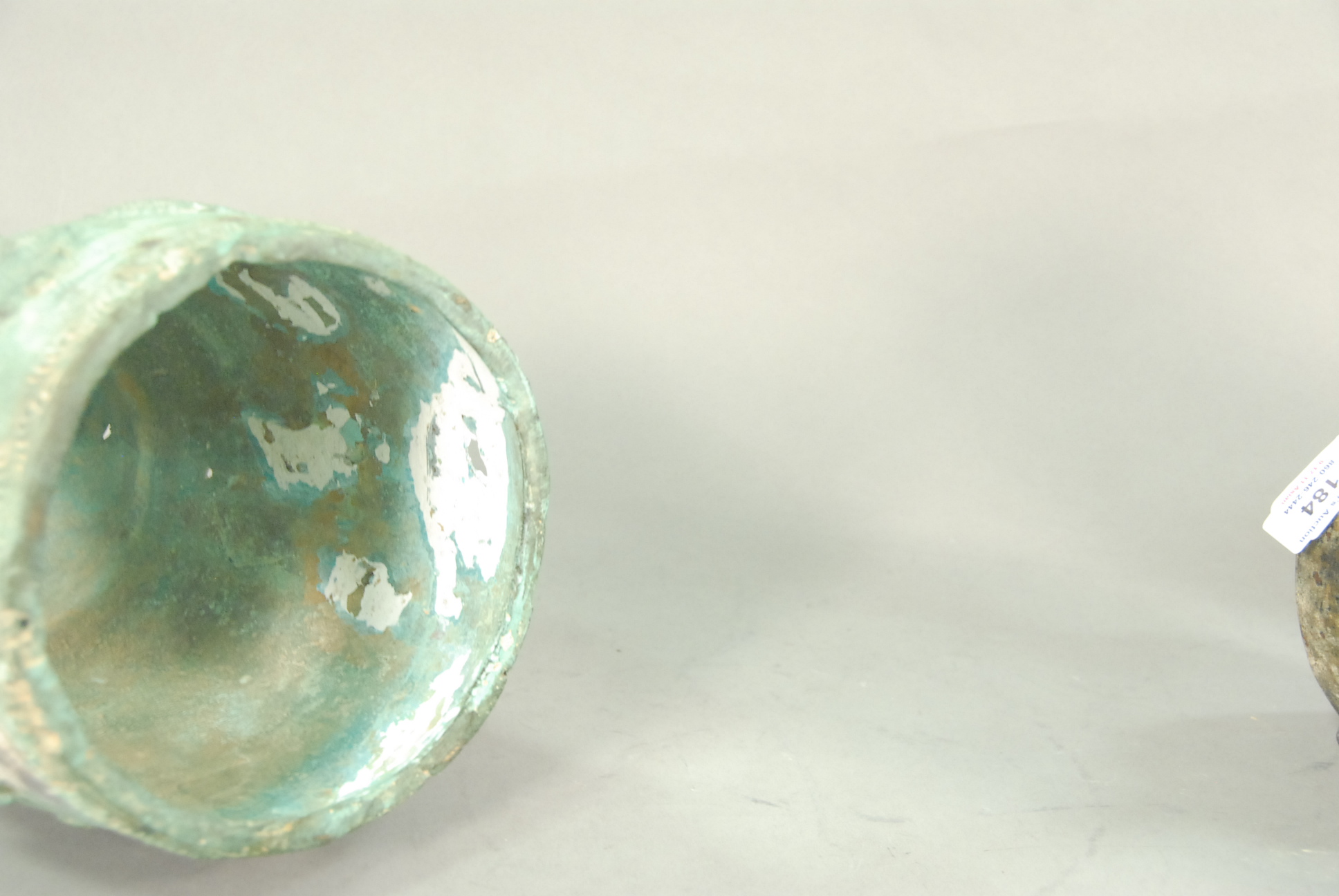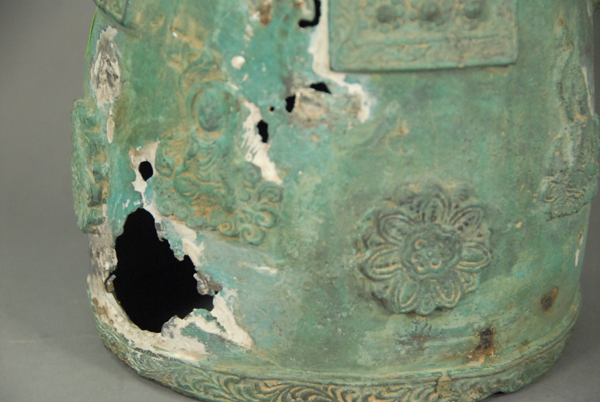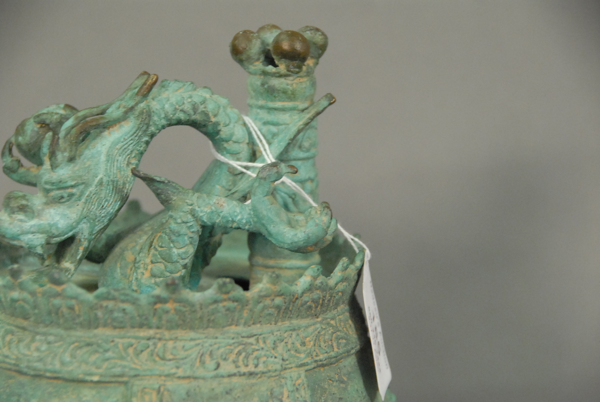 Bronze archaic bell with dragon finial top and Buddha molded around exterior.